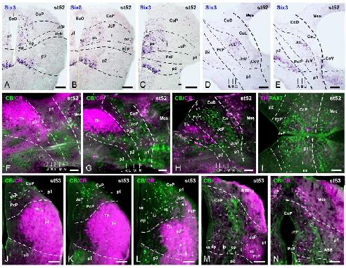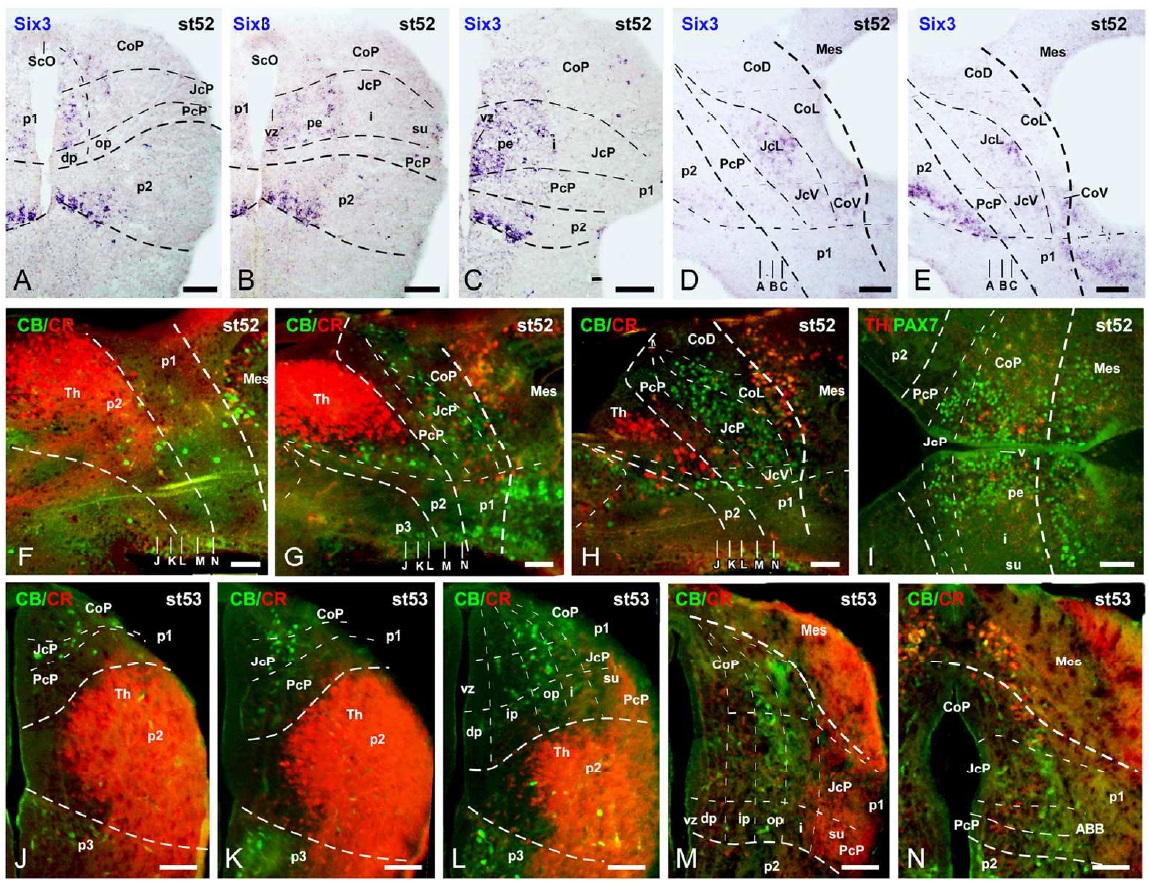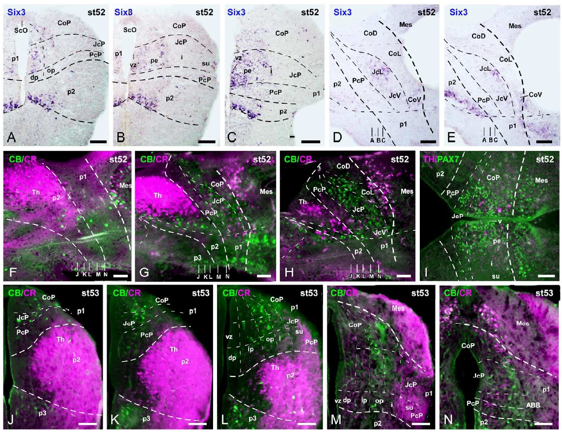Supplementary Figure 6. Sections of larval brains at stages between pre and prometamorphosis (st52 and st53) of Xenopus laevis showing in situ hybridization (ISH) for Six3 (in blue) and immunohistochemistry (IHC) for PAX7, CB, CR and TH (in green and magenta). The markers shown in each panel are indicated in appropriate color code in the upper left corner. Rostral is oriented to the left in sagittal (D,E, F-H) or horizontal (I) views. Dorsal is oriented upwards in oblique-transverse sections (A-C, J-N). In panels D-H the levels of sections shown in other panels are indicated by bars. A-C: Six3 ISH in a series of transverse sections of the pretectal region showing the rostrocaudal distinct expression in the periventricular and intermediate strata of the JcP, and the very low expression in the CoP, with the exception of the CoV subdomain, which is better observed in sagittal sections (D, E). F-H: Sagittal sections showing the lateromedial codistribution of CB and CR in the pretectum. CB is abundant in the JcP and CoP (CoL), and is codistributed with CR in the CoL caudally. CR is present in the rostral part of the JcL and in some cells in the PcP. I: Localization of TH cells in the dorsal domain of the CoP, compared with PAX7, in a horizontal section. J-N: Transverse sections showing the rostrocaudal codistribution of CB and CR in the pretectum. CB is profuse laterally in the CoL and JcP, whereas CR staining is located medially. For abbreviations see list. Scale bars = 100 μm. This figure corresponds to the Figure 8. |