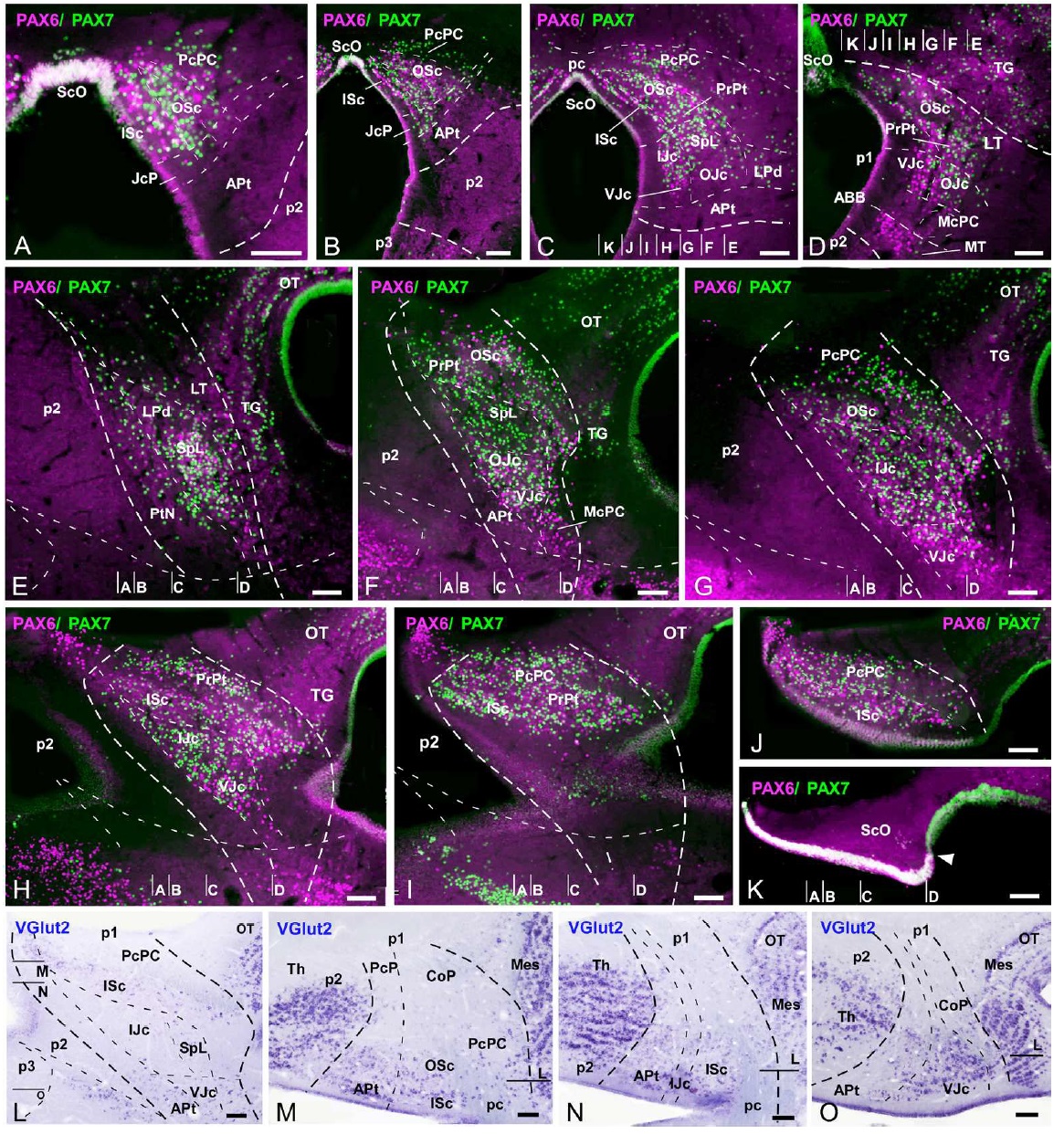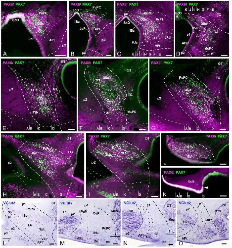 Supplementary Figure 7. Various genoarchitectural details in sections of the pretectal region of Xenopus laevis at the end of the metamorphic climax (st64-66) showing the combined patterns of PAX6 (in magenta) and PAX7 (green) (A-K), and ISH for VGlut2 (in blue (L-O). The markers shown in each panel are indicated in appropriate color code in the upper left corner. Dorsal is oriented upwards in oblique-transverse sections (A-D). Rostral is oriented to the left in sagittal sections (E-L) and horizontal (M-O) sections. In panels C-f and H-O the levels of sections shown in other panels are indicated by bars. Throughout the rostrocaudal extent of the pretectum, PAX6 cells are intensely labeled in the medial and caudal portions of the OSc nucleus, the LT and the magnocellular nucleus of the posterior commissure (McPC). PAX6 cells extend in the ventromedial portion of the Jc nucleus and very scarce in lateral portions. PAX7 is more intense in the OSc and along the lateral parts of the JcP (A-F). The ventricular PAX6 labeling reaches the APt domain, but is more intense in the JcP and CoP (A-D), and ends caudally at the DMB (K). PAX7 ventricular expression is restricted to the CoP (A-C, K). L-O: VGlut2 ISH in a sagittal (L) view (level indicated in M-O) and a series of horizontal sections (M-O) showing the intense expression in the ISc and OSc nuclei of the dorsal CoP domain. Distinct VGlut2 expression is present in the periventricular layer of the medial portion of the APt nucleus (M). For abbreviations see list. Scale bars =100 μm. This figure corresponds to the Figure 11. |