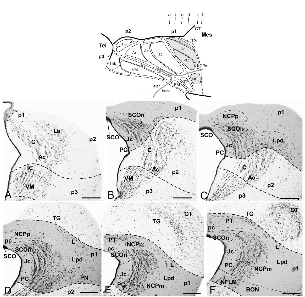 Figure 1. Rostrocaudal series of Nissl-stained sections (40 μm-thick) through a 5-years-old Xenopus brain (levels of the transverse sections A-F are indicated in the upper schematic drawing of a sagittal view of the diencephalon) illustrating the general cytoarchitecture of the pretectal region, which is enclosed by thick dashed lines and highlighted in gray. The abbreviations refer to the nomenclature classically used for the cell groups in the pretectum of anurans. For abbreviation, see list. Scale bars = 200 μm. |