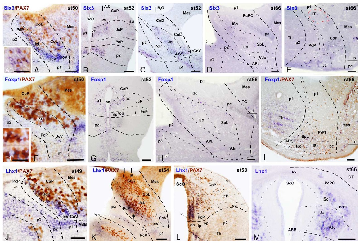 Figure 3. Set of photomicrographs illustrating the main markers for the JcP domain and its derivatives, at different larval stages. In each panel the stage is indicated in the upper right corner. In situ hybridization (ISH) for Six3, Foxp1 and Lhx1 (in blue) and IHC for PAX7 (in brown) are shown. The markers and the color code are indicated in the upper left corner. Rostral is oriented to the left in all sagittal (A,C,D,F,H,J,K) and horizontal (E,I) views. Dorsal is oriented upwards in transverse sections (B,G,L,M). In panels B, C, H, I and K the levels of sections shown in other panels are indicated by bars. A: Sagittal section at early premetamorphic stage stained for Six3 ISH showing intense expression in the JcP domain and the ventral subdivision of the CoP, and only weak expression in the lateral and dorsal subdivisions of CoP. PAX7 IHC revealed positive cells in the JcP within the Six3 domain. A1: Higher magnification showing double labeled Six3/PAX7 cells in the JcP. B, C: Six3 expression in the JcP at late premetamorphic stages shown in a transverse (B) and sagittal section (C). The PcP is devoid of Six3 cells, which are intensely detected in the JcP. Note some intense Six3 cells in the CoV and only sparse cells in the CoP. D, E: Six3 expression in the pretectal region at the metamorphic climax is reduced to cells in the IJc and some weakly labeled cells in the CoP. Note Six3 positive cells also in the LT nucleus of the superficial stratum (E). F: Distribution of Foxp1 ISH combined with PAX7 IHC at early premetamorphic stages. Foxp1 marks intensely the JcP domain except for its ventral subdivision. F1: Higher magnification of the JcP showing PAX7 cells within the Foxp1 positive domain, with some double labeled cells. G: Foxp1 expression at late premetamorphic stages is shown in a subpopulation of the JcP (asterisk) in the same location where Six3 cells are absent at the same stages (compare B and G). H, I: Foxp1 expression at the metamorphic climax is reduced to some cells in the IJc and in a part of the OJc, proposed as the homologous of the SpL. J: Lhx1 ISH combined with PAX7 IHC at early premetamorphic stages. Lhx1 marks intensely the JcP domain, including the ventral subdivisions, negative for PAX7 (JcV and also CoV). K, L: Intense Lhx1 expression is shown at mid-late premetamorphic stages in the JcP and inpart of the PcP. M: At the metamorphic climax Lhx1 cells are intensely labeled in the VJc and IJc. Some cells are positive also in the CoP derivatives (PcPC, PrPt and ISc). Compare A, F, J sagittal sections, which highlight the shape of the JcP domain revealed by Six3, Foxp1 and Lhx1. For abbreviations see list. Scale bars = 100 μm (A-M); 50 μm (A1-F1). |