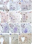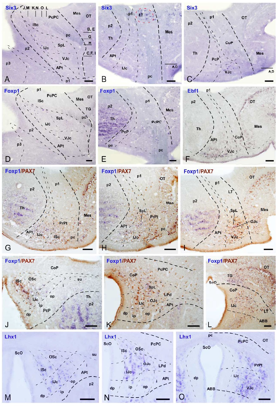 Figure 10. Various genoarchitectural details in sections of the pretectal region of Xenopus laevis at the end of the metamorphic climax (st64-66) showing ISH for different markers (in blue) and IHC for PAX7 (in brown). The markers shown in each panel are indicated in appropriate color code in the upper left corner. Rostral is oriented to the left in sagittal (A, D) or horizontal (B, C, E-I) sections. In all horizontal sections, the right side is upwards. Dorsal is oriented upwards in oblique-transverse sections (J-O). The approximate level of each transverse and horizontal section is indicated in A. A-C: Six3 ISH in a sagittal (A) and a horizontal (B, C) sections showing the intense expression in the IJc and in a superficial area in the lateral terminal nucleus (red dashed lines in B). D, E: Foxp1 ISH in sagittal (D) and horizontal (E) sections showing the characteristic reduced expression in the lateral parts of the IJc, ISc and SpL nuclei. F: Ebf1 ISH in comparable horizontal section as in C and I showing the position of the expressing cells in the APt and VJc nuclei. G-L: Foxp1 ISH combined with PAX7 IHC demonstrates Foxp1 expression in a specific cell group in SpL, in horizontal (G, I) and transverse (J-L) sectionsshowing the distribution . MO: Lhx1 expression in transverse sections showing intensely labeled cells in the JcP subdivisions, and lighter cells in the PcP derivatives. For abbreviations see list. Scale bars = 100 μm. |