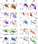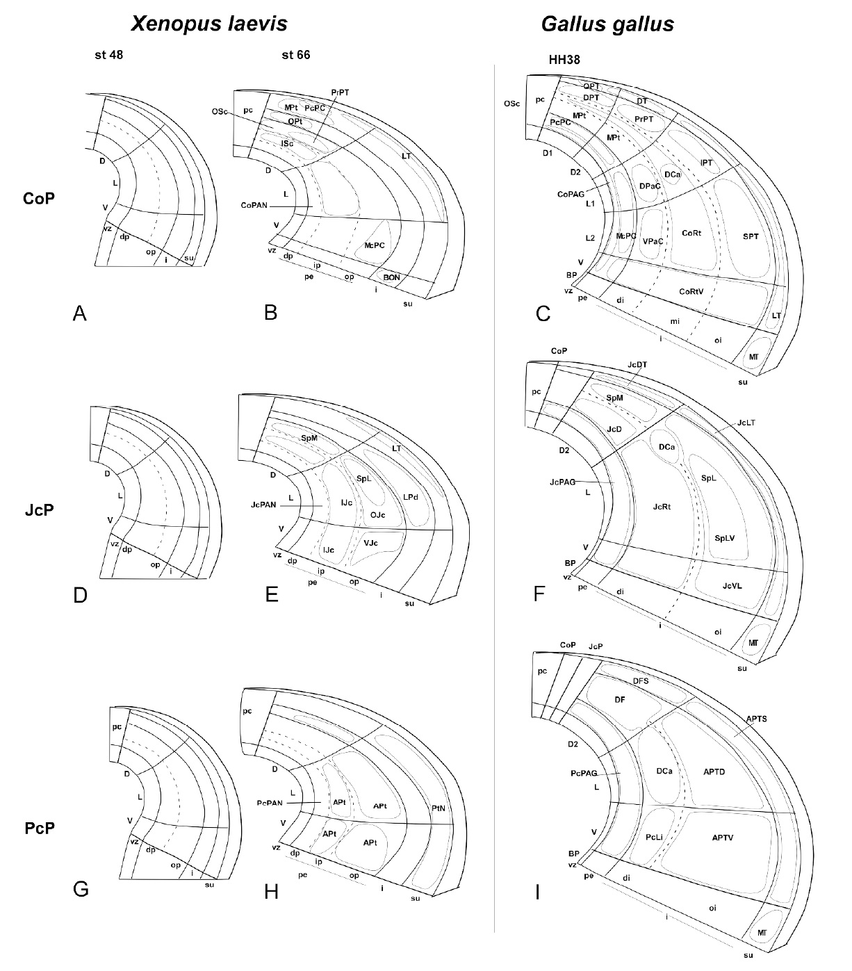Figure 14. Schematic rendering of strata, layers, and individual nuclei or areas observed at the beginning of the premetamorphosis (st50) and at the climax of the metamorphosis (st66) in the pretectum of Xenopus laevis, and its comparison with the case of the chicken at stage HH38 (after 12 days of incubation; modified from Ferran et al., 2009). The derivatives of the CoP (AC), JcP (D-F) and PcP (G-I) are illustrated separately. For each domain, the early definition of dorsal, lateral and ventral portions and the strata distinguished at the beginning of the larval development (A,D,G) are correlated topologically with the final nuclear derivatives proposed for each part at the end of the metamorphosis (B,E,H). The nuclear organization is compared for each case with the final nuclei observed after development in the pretectum of the chick (C,F,I). The ventricular (v), inner (ip) and outer (op) periventricular, intermediate (i) and superficial (su) strata (pronuclei) were distinguished in the mantle zone at early premetamorphic stages, and segregation is achieved within the layers and strata of the periventricular zone at the metamorphic climax. Newly defined nuclei can be correlated topologically to the earlier strata and to the dorsal (D), lateral (L) and ventral (V) progenitor subdomains, where their neurons presumably originated via radial migration. Note that most cell masses have undergone different displacements and the JcP occupies a significant area that contains more cells groups than the CoP and PcP derivatives. For abbreviations, see list. |