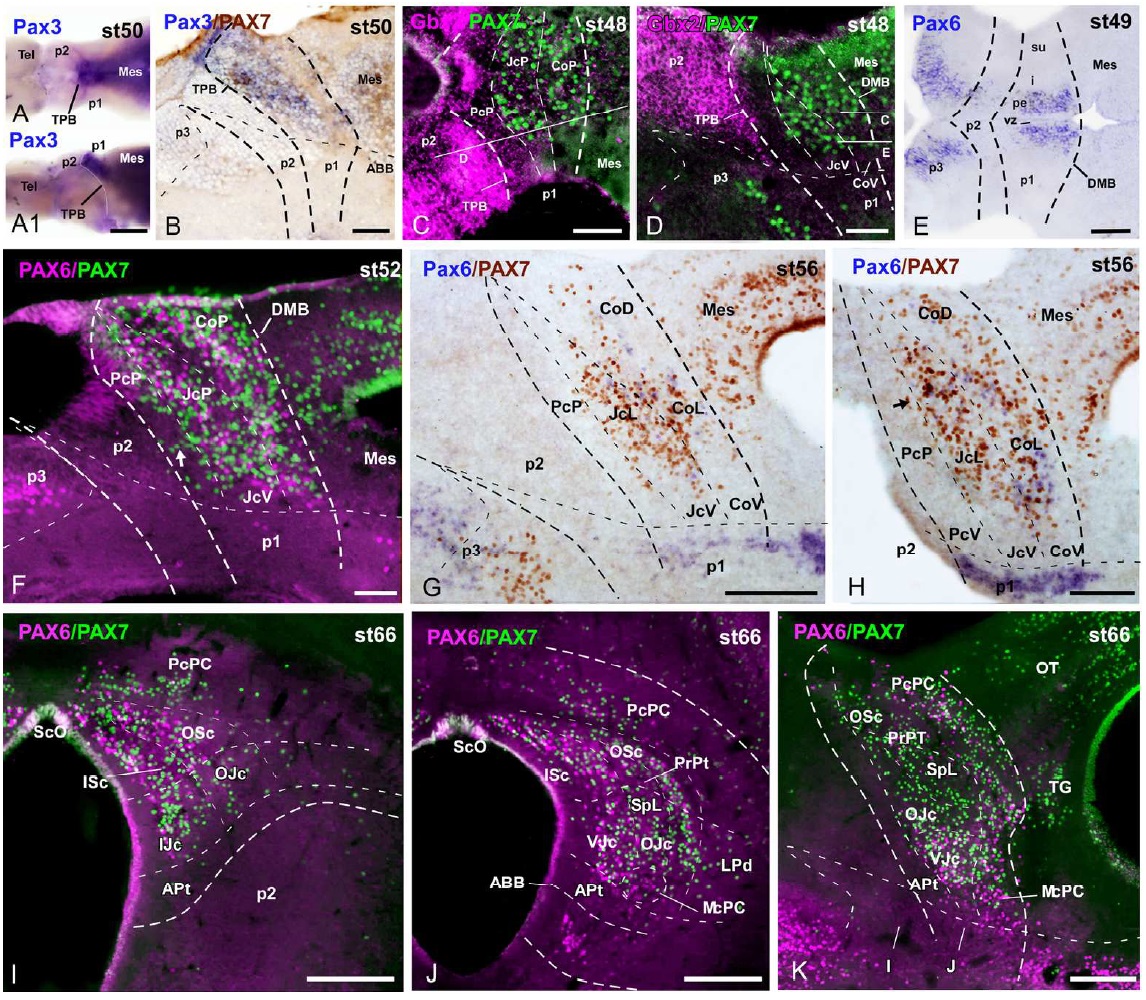 Figure 2. Set of photomicrographs illustrating the main markers for the CoP domain and its derivatives, as well as the rostral and caudal boundaries of the pretectum. In each panel the larval stage is indicated in the upper right corner. In situ hybridization (ISH) for Pax3, Pax6 and Gbx2 (in blue for bright field or red in the case of fluorescent images) and immunohistochemistry (IHC) for Pax6 and Pax7 or Nkx2.2 (in brown for bright field or green/red for fluorescent images) are shown. The markers and the color code are indicated in the upper left corner. Rostral is oriented to the left in all sagittal (B,D,F-H,K) and horizontal (C,E) views. Dorsal is oriented upwards in cross sections (I,J). In panels C, D and K the levels of sections shown in other panels are indicated by bars. A, A1: Pax3 ISH in whole mount brain, in dorsal and lateral view respectively, B: Sagittal section showing the ventricular and periventricular expression of Pax3 that delimitate the rostral thalamo-pretectal boundary (TPB). C, D : Gbx2 (ISH) in combination with PAX7 (IHC) showing the thalamo-pretectal boundary (TPB) defined by Gbx2 in the thalamus and the Gbx2 /PAX7 negative PcP domain. E: Horizontal sections showing the caudal diencephalomesencephalic boundary (DMB) revealed by Pax6 ISH . F: Sagittal section of the pretectal region at advanced prometamorphosis showing PAX6 and PAX7 immunoreactive cells. PAX6 labeling marks the caudal DMB and the combination with PAX7 shows that PAX6 positive cells are in the CoP domain at this stage. Note the scarce PAX6 cells in the PcP domain. G, H: Sagittal sections of advanced prometamorphic larvae through the superficial (G) and intermediate (H) strata showing the codistribution of Pax6 and PAX7 labeled cells. Pax6 is present mainly in the CoL and the ventral part of JcL at this stage. PAX7 positive cells are abundant in the intermediate strata in the CoP and JcP with only some cells in the PcP (black arrow H). I-K: Various genoarchitectural details in sections through the CoP and JcP pretectal regions at the end of the metamorphic climax. PAX6 cells are abundant in the ISc and OSc regions, the parvocellular nucleus of the posterior commissure (PcPC), and the magnocellular nucleus of the posterior commissure (McPC). PAX6 cells extend primarly in the ventromedial portion of the Jc nucleus. PAX7 cells are found in the OSc and ISc, and along the lateral parts of Jc nucleus. The ventricular PAX6 cells reach the APt domain, but are more intensely labeled in the JcP and CoP, whereas PAX7 ventricular labeling is restricted to the CoP (I, J). For abbreviations see list. A magenta-green version of this figure is provided as Supporting Information Figure 1. Scale bars = 200 μm (A, A1, G-K); 100 μm (B-F). |