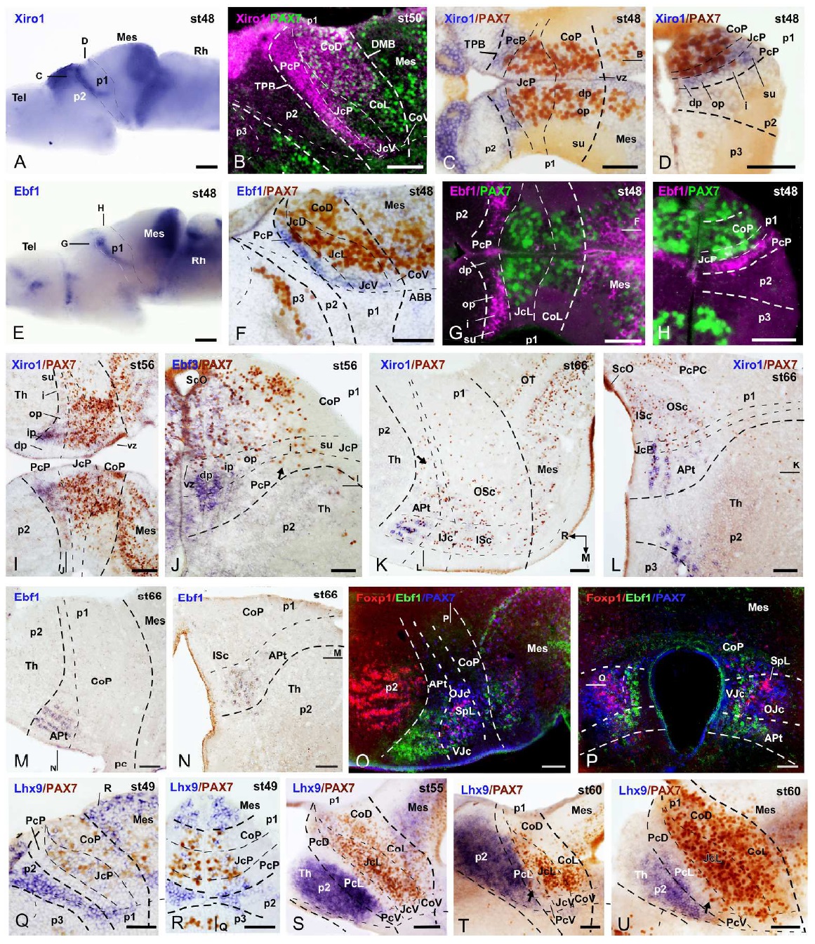 Figure 7. Wholemounts and brain sections of premetamorphic larvae (stages indicated on each photomicrograph) of Xenopus laevis showing in situ hybridization (ISH) for different markers (in blue for bright field or red in the case of fluorescent images) and immunohistochemistry (IHC) for PAX7 (in brown for bright field or green for fluorescent images). The markers shown in each panel are indicated in appropriate color code in the upper left corner. Rostral is oriented to the left in sagittal (I, M, P-R) or horizontal (F-H, J-L, N, O, S-V) views. Dorsal is oriented upwards in oblique-transverse sections (A-E). In A, I , K, Q -U the different levels of the sections is indicated for the corresponding photomicrographs. A-C: Transverse sections through the pretectal region showing the rostrocaudal distribution of Xiro1 combined with PAX7 IHC. Note the PcP intensely marked for Xiro1 in all radial strata. D, E: Transverse sections through the pretectal region (levels indicated in I) showing the rostral (D) and caudal (E) distribution of Ebf1 ISH combined with PAX7 IHC. The PcP domain is intensely marked for Ebf1 in the intermediate and superficial strata. F-H: Horizontal sections through the pretectal region (levels indicated in I) showing the dorsoventral distribution of Xiro1combined with PAX7 IHC. Xiro1 expression serves to assess the shape of the PcP. I: Sagittal section that shows the intense Ebf1 expression in the PcP domain, which lacks PAX7 cells. J-L: Horizontal sections through the pretectal region (levels indicated in I) showing the distinct Ebf1 expression in the PcP domain, free of PAX7 cells. Ebf1 is useful for the identification of the rostral TPB. Notice the PAX7 positive cells into the PcP domain (arrows in J, K). M: Sagittal section showing the intense Ebf3 expression in the PcP domain, similar to Ebf1 (compare with I). N, O: Horizontal sections showing that the pattern observed for Ebf1 is similar for Ebf3. P: Lateral overview of a wholemount brain stained for NPY ISH. Q, R: Sagittal sections showing the lateromedial distribution of NPY in the JcP and CoP domains. NPY marked the CoD, CoL subdomains in the CoP and the lateral JcL subdomain in the JcP. S-V: Horizontal sections of the pretectal region showing the dorsoventral differential distribution of NPY in the JcP and CoP domains (shown in Q and R). For abbreviations see list. A magenta-green version of this figure is provided as Supporting Information Figure 5. Scale bars = 100 μm (P), 50 μm (A-O, Q-V). |