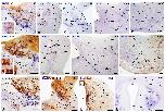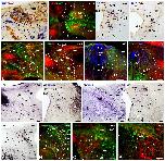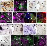 Supplementary Figure 3. Set of photomicrographs illustrating the main complementary markers used to characterize further the PcP, JcP and CoP derivatives of the pretectum. In each panel the larval stage is indicated in the upper right corner. In situ hybridization (ISH) for NPY (in blue for bright field or magenta in the case of fluorescent images) and immunohistochemistry (IHC) for PAX7, CB, CR, and TH (in brown for bright field or green/magenta/blue for fluorescent images) are shown. Some sections were also Nissl counterstained. The markers and the color code are indicated in the upper left corner. Rostral is oriented to the left in all sagittal (A, E, F, I, K, M, N) or horizontal (B) views. Dorsal is oriented upwards in transverse sections (C, D, G, H, J, L, O, P). In panels A, B, F, I-L the levels of sections shown in other panels are indicated by bars. A, B: NPY ISH and Pax7 IHC at the beginning of the premetamorphosis in sagittal (A) and horizontal (B) sections showing the distribution of NPY in the JcP and CoP. NPY marks the CoD and CoL domains, and the caudal and lateral subdivision of the JcL. C, D: Oblique-transverse sections at metamorphic climax stages showing the intense NPY expression in the OSc and weak expression in ISc. In the JcP derivatives, distinct NPY expression is shown in the SpL (larger cells) and the OJc (smaller cells intermingled with PAX7 positive cells). E, F: CB/CR IHC in sagittal sections at premetamorphic (E) and prometamorphic (F) stages showing CB staining in the rostral part of CoD and dorsally in CoL . CB is abundant in the rostral part of the intermediate stratum of the JcP. CB cells are codistributed with CR cells along CoL and JcL. CR is present in cells of the ventral half of the PcL and PcV. G: Transverse section at premetamorphic stages showing a distinct TH positive population within the dorsal portion of CoP, characterized by CB and Pax7 immunoreactive cell population. H: Transverse section at prometamorphic stages showing the codistribution of CBir and CRir cell populations in the CoP and JcP, characterized by the Pax7 cell population. I-L: Distribution of CR (I, J) and CB (K, L) at metamorphic climax illustrating several specific nuclear and neuropil formations of the pretectum. CR immunoreaction in a sagittal (I) and coronal section (J, level indicated in I) showing the TPB and numerous cells in the APt nucleus, and sparse cells in LPd , OJc and IJc, and numerous cells in the OSc and ISc. CB immunoreaction (K, L) at comparable levels shows abundant CB cells in the PcPC, OSc and IJc. M, N: TH immunoreactivity in the CoD and CoL at prometamorphic stages. O, P: Transverse sections through the CoP at metamorphic climax showing the THir cell population in combination with CB (O) and CR (P) in the OPt nucleus. For abbreviations see list. Scale bars = 50 μm (A, B); 100 μm (C-P). This figure corresponds to the Figure 5. |