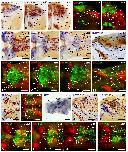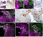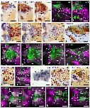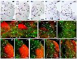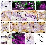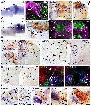 Supplementary Figure 4. Whole mounts or brain sections of premetamorphic larvae (stages indicated on each photomicrograph) of Xenopus laevis showing in situ hybridization (ISH) for different markers (in blue for bright field or magenta in the case of fluorescent images) and immunohistochemistry (IHC) for PAX7 or NKX2.2 (in brown for bright field or green for fluorescent images). The markers shown in each panel are indicated in appropriate color code in the upper left corner. Rostral is oriented to the left in sagittal (B, F-H, O, P) or horizontal (A, C, D, I-N, O1) views. Dorsal is oriented upwards in oblique-transverse sections (E, Q, R). In G and R the different levels of the sections is indicated for the corresponding photomicrographs. A: Horizontal section showing Pax6 ISH, which caudally marks the DMB. B: Sagittal section through the pretectal region showing that the Pax6 signal marks the DMB and the combination with PAX7 helps the localization of the Pax6 cells in the CoP and distinct subdomains of the JcP. C-E: Horizontal (C, D) and transverse (E) sections showing CR and PAX7 IHC. CR marks the TPB and PAX7 marks the CoP and JcP, showing the PcP domain devoid of labeling. F-H: Sagittal sections stained for Six3 ISH that marks intensely the JcP domain and the ventral subdivision of the CoP (CoV) and less intensely the lateral (CoL) and dorsal (CoD) subdivisions. PAX7 IHC reveals PAX7 cells in the JcP within the Six3 domain. I-N: Dorsoventrally arranged horizontal sections through the pretectal region at the levels indicated in P and Q, showing the distribution of Six3 ISH combined with PAX7 IHC. Note that the PcP is devoid of both markers and the JcP is characterized by the presence of intense Six3 expression; some cells expressing Six3 are located in the CoP. H1, M1: Higher magnifications of the JcP in H and M, respectively, illustrating some double labeled cells (arrowheads). O1: Dorsal overview of a wholemount brain stained for Zic1 ISH. O: Sagittal section showing intense Zic1 expression in the dorsal division of the PcP, JcP and CoP. P: sagittal section showing Lhx1 expression in the JcP in combination with NKX2.2 IHC that marks the ABB. Lhx1 expression reaches the NKX2.2 positive band ventral to the JcP and CoP. Q: Cross section showing the Lhx1 expression, in relation to PAX7, in the JcP. R: Schematic representation of the pretectal region of premetamorphic larvae and the radial subdivisions. Levels of sagittal sections are also indicated. For abbreviations see list. Scale bars = 100 μm (A-E, R), 50 μm (FQ), 25 μm (H1, M1), 500 μm (O1). This figure corresponds to the Figure 6. |