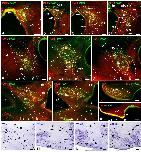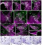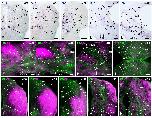 Supplementary Figure 2. Set of photomicrographs illustrating the main markers for the PcP domain and its derivatives, at different larval stages. In each panel the stage is indicated in the upper right corner. In situ hybridization (ISH) for Xiro1, Ebf1, Ebf3 and Lhx9 (in blue for bright field or magenta/green in the case of fluorescent images) and immunohistochemistry (IHC) for Pax7 (in brown for bright field or green /blue for fluorescent images) are shown. The markers and the color code are indicated in the upper left corner. Rostral is oriented to the left in all sagittal (A, B, E, F, Q, S-U) or horizontal (C, G, I, K, M, O) views. Dorsal is oriented upwards in transverse sections (D, H, J, L, N, P, R). In panels E, G, and K-R the levels of sections shown in other panels are indicated by bars. A: Xiro1 ISH in wholemount brain in a lateral view. B-D: Sagittal (B), horizontal (C) and transverse (D) sections though the pretectal region showing Xiro1 ISH combined with PAX7 IHC at early premetamorphic stages. The PcP is intensely marked for Xiro1 highlighting the rostral TPB, and it is also expressed in the dorsal domains of the JcP and CoP. Note that Xiro1 is expressed in all radial strata at these stages. E: Ebf1 ISH in wholemount brain in a lateral view. F-H: Sagittal (F), horizontal (G) and transverse (H) sections though the pretectal region showing Ebf1 ISH combined with PAX7 IHC at late embryonic stages. Ebf1 expression marks intensely the intermediate and superficial strata of the PcP and highlights. Note the Ebf1 is also expressed in the ventral domain of the JcP and CoP. I: Xiro1 expression at prometamorphic stages is mainly located in the periventricular stratum of the PcP. J: Ebf3 expression is found in similar location of the PcP as Xiro1, at prometamorphic stages. K, L: In the metamorphic climax Xiro1 is expressed along the medial portions of the APt nucleus and is only weakly expressed in its lateral part. Note that some cells expressed Xiro1 in the medial part of the JcP. M, N: Similar to Xiro1, Ebf1 expression was found in the APt nucleus at metamorphic climax stages. O, P: Ebf1 also labels a portion of the VJc distinct from the OJc (Ebf1 negative) that contains the SpL (Pax7/Foxp1 positive). Q, R: Lhx9 expression at late premetamorphic stages is restricted to the outer periventricular stratum in the PcP (R). Note the gap devoid of labeling in the inner periventricular stratum, in the sagittal section (Q). S: At prometamorphic stages Lhx9 labels the PcL but it is absent in the PcD and PcV. T,U: Lhx9 is expressed in the PcL at metamorphic climax stages as seen in these lateral superficial (T) and periventricular (U) sagittal sections. For abbreviations see list. Scale bars = 100 μm (A, E, I-U); 50 μm (B-D, F-H). This figure corresponds to the Figure 4. |