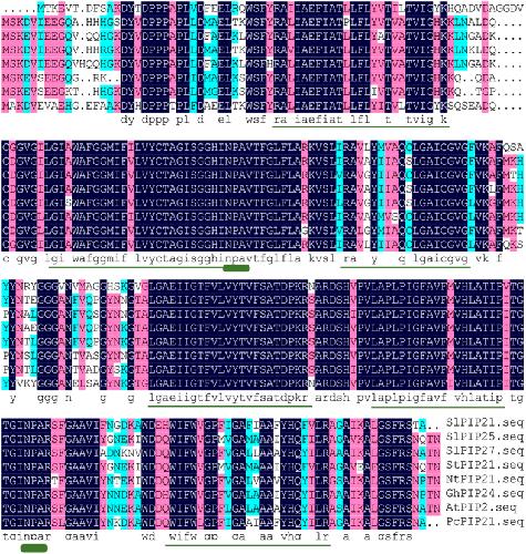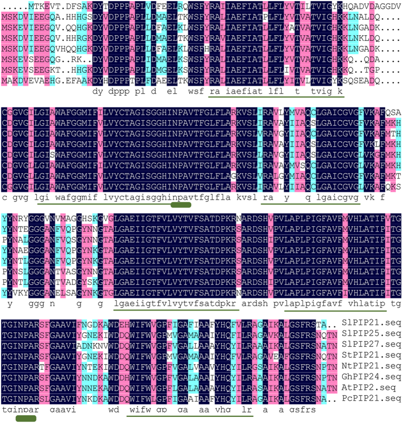 Figure 3. Alignment of predicted amino acid sequence of tomato aquaporins (SlPIP2;1, SlPIP2;7 and SlPIP2;5) with other aquaporins (DNAMAN). The predicted amino acid sequences of SlPIP2;1, SlPIP2;7 and SlPIP2;5 were compared with aquaporins from different sources. Transmembrane domains are shown with a dashed line below the alignment; circles indicate the NPA selectivity filter. |