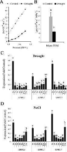 Figure 6. Root hydraulic conductivity of tomato plants. (A) The relation between P to Jv of water supplied in tomato root system. (B) Hydraulic conductivity of tomato roots under normal and drought stress. Theroot hydraulic conductance was down regulated under drought treatment. Significant differences were determined by Duncan’s multiple range test (P < 0.05). Error bars indicate SD (n = 3). Drought (C) and salt (D) regulation of SlPIP2;1, SlPIP2;7 and SlPIP2;5 expression in tomato roots. Significant differences were determined by Duncan’s multiple range test (P < 0.05). Error bars indicate SD (n = 3). |