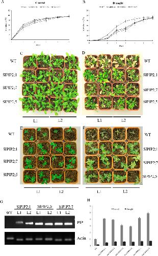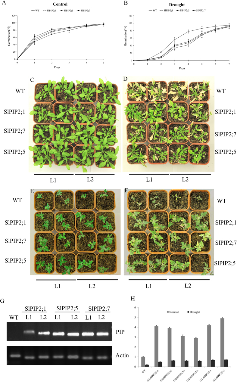 Figure 7. Growth of the wild-type and transgenic plants under normal and drought growth conditions. (A) Germination rates of the wild-type and transgenic Arabidopsis under normal conditions. Error bars indicate SD (n = 3). (B) Germination rates of the wild-type and transgenic Arabidopsis under drought conditions. Error bars indicate SD (n = 3). (C) The wild-type and transgenic Arabidopsis plants were photographed 20 days after germination on soil before drought treatment. (D) Phenotypes of wild-type and transgenic Arabidopsis plants subjected to drought stress for 10 days. (E) The wild-type and transgenic tomato plants were photographed 30 d after germination on soil before drought treatment. (F) Phenotypes of wild-type and transgenic tomato plants subjected to drought stress for 15 days. L1: Transgenic line1; L2: Transgenic line2.Confirmation of the transgenic lines. RT- PCR or real time quantitative analyses of the expression of SlPIP2;4, SlPIP2;5 or SlPIP2;7 in the wild-type plants and independent transgenic lines (L-1and L-2) in (G) two week-old whole Arabidopsis plants grown in MS medium and (H) two-week-old tomato plants grown in MS medium. |