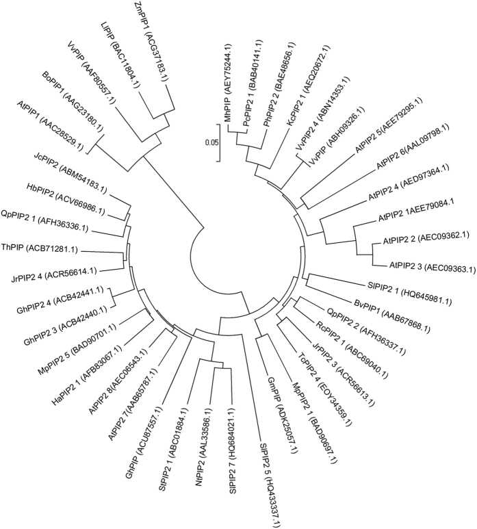 The predicted amino acid sequences of the three SlPIP2s and their corresponding sequences from other species were aligned using the ClustalW2 sequence alignment program. The phylogenetic tree was constructed using MEGA6 software. |