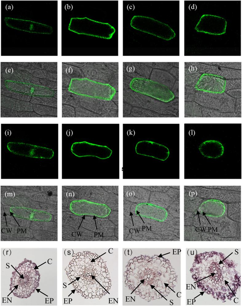 Figure 4. (a–p) Subcellular localizations of SlPIP2;1, SlPIP2;7 and SlPIP2;5 in onion epidermal cells. The fusion protein SlPIP2;1–GFP (a,e,i,m), SlPIP2;7–GFP (b,f,j,n), SlPIP2;5–GFP (c,g,k,o) and GFP alone (d,h,l,p) were transiently expressed under the control of the cauliflower mosaic virus 35S promoter in onion epidermal cells.Images are dark field for green fluorescence (a–d, i–l,); merged (e–h, m–p); plasmolysed the cells with 0.8 M mannitol (i–p). PM, plasma membrane; CW, cell wall. (r–u) Tissue localization of expression of aquaporins in roots of tomato. Expression was analyzed by in situ hybridization in root. Three candidate aquaporin genes SlPIP2;7 (t) and SlPIP2;1 (u) were studied, panel (r) is the positive control and panel (s) is the negative control. EP:epidermis, C: cortex, EN: endodermis, S: stele. Bar = 400 μm. |