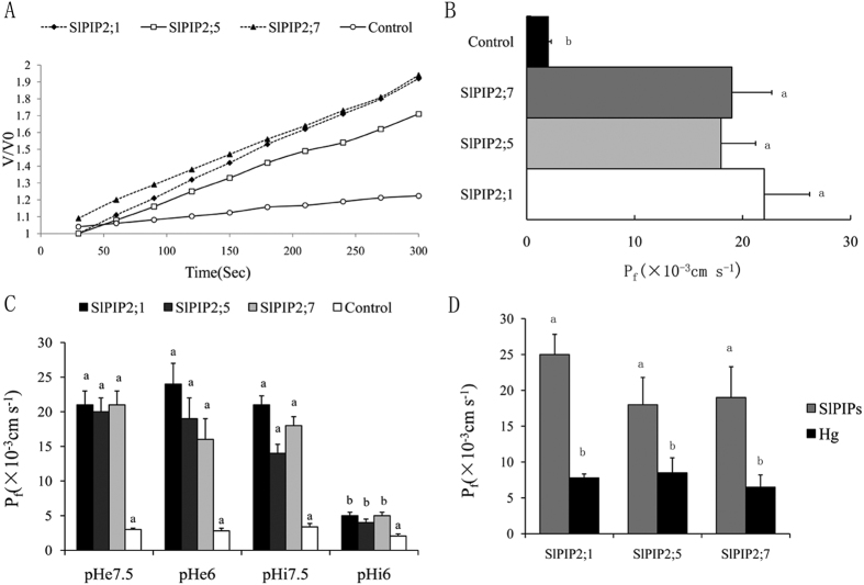 Figure 5. Assay on functional expression of SlPIP2;1, SlPIP2;7 and SlPIP2;5 in Xenopus oocytes.(A) Increase in relative volume of oocytes injected with SlPIP2;1, SlPIP2;7 and SlPIP2;5 cDNA after transfer to hypoosmotic medium, using water as control. (B) Pf-values of oocytes injected with SlPIP2;1, SlPIP2;7 and SlPIP2;5 cRNA, using water as the control. Pf of oocytes expressing SlPIP2;1, SlPIP2;7 and SlPIP2;5 present significant differences from negative control. Significant differences were determined by Duncan’s multiple range test (P < 0.05). Error bars indicate SD (n = 3). (C) SlPIP2;1, SlPIP2;7 and SlPIP2;5 expressing oocytes were exposed to different external (pHe) or internal (pHi) pH conditions. Pf for oocytes expressing SlPIP2s exposed to internal acidification is statistically different from itscontrol (i.e. pHi = 7.5), while treatment with pHe = 6.0 does notresult in a significant inhibition when compared with itscontrol (pHe = 7.5). Significant differences were determined by Duncan’s multiple range test (P < 0.05). Error bars indicate SD (n = 3). (D) SlPIP2;1, SlPIP2;7 and SlPIP2;5 expressing oocytes were exposed to 100 mM HgCl2 condition. Pf for oocytes expressing SlPIP2s exposed toHg result in a significant inhibition when compared with itscontrol. Significant differences were determined by Duncan’s multiple range test (P < 0.05). Error bars indicate SD (n = 3). |