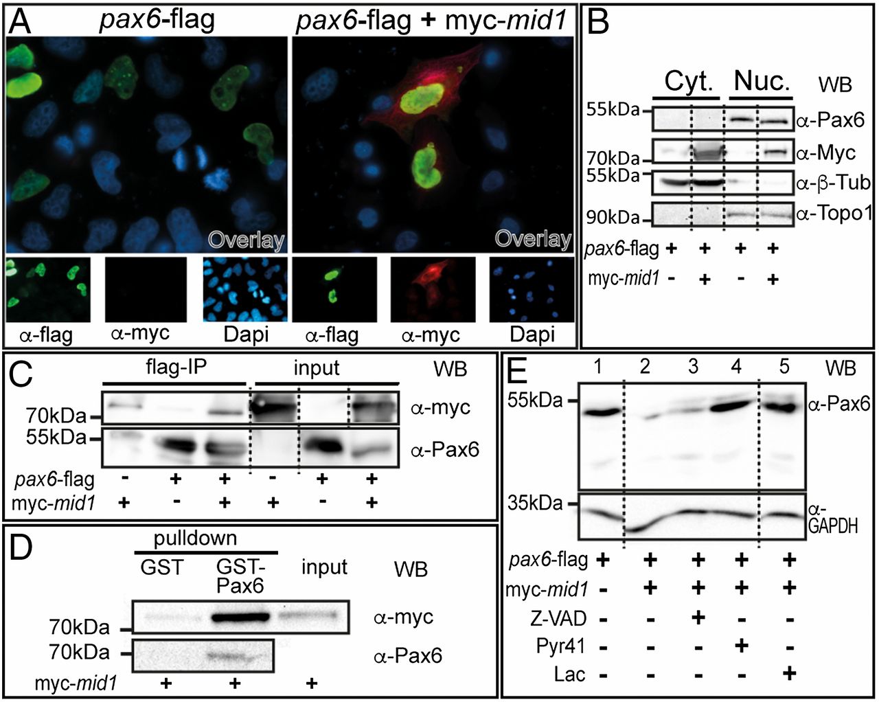 Fig. 2. Mid1 physically interacts with Pax6. (A) HeLa cells were transfected with pax6-flag alone or combined with myc-mid1 and analyzed by immunohistochemistry. Nuclei were stained with DAPI. Pictures are shown in false colors: green for Pax6, red for Mid1, blue for nuclei (Bottom). (B) HEK293 cells were transfected as in A. Cytosolic proteins were extracted with hypotonic buffer. Soluble nuclear proteins were extracted from the remaining fraction with high salt buffer. Blot shows Mid1 and Pax6 in the cytosolic (Cyt.) and nuclear (Nuc.) fractions, as well as the reprobes with antiâβ-tubulin or anti-topoisomerase 1 antibody to control purity. (C) Interaction of Mid1 with Pax6 was assessed by coimmunoprecipitation performed in HEK293. (Left) Eluted myc-tagged proteins after immunoprecipitation (upper blot) and precipitated Pax6 (lower blot, reprobed with anti-Pax6 antibody). (Right) Blots for the input proteins. (D) Interaction of Mid1 and Pax6 was verified by GST using purified GST-Pax6 or purified GST as a control and lysates of HEK293 cells transfected with myc-mid1. (Left) Eluted myc-tagged proteins after GST pull down (upper blot) and precipitated Pax6 (lower blot, reprobed with anti-Pax6 antibody). (Right) Input protein of the lysate. (E) Pax6-flag was expressed alone or together with myc-Mid1 in HEK293 cells in the presence or absence of the proteasome inhibitor lactacystin (Lac), the E1 activating enzyme inhibitor Pyr41, or the caspase inhibitor Z-VAD-FMK (Z-VAD) as indicated. For loading control, blots were reprobed with an anti-GAPDH antibody. |