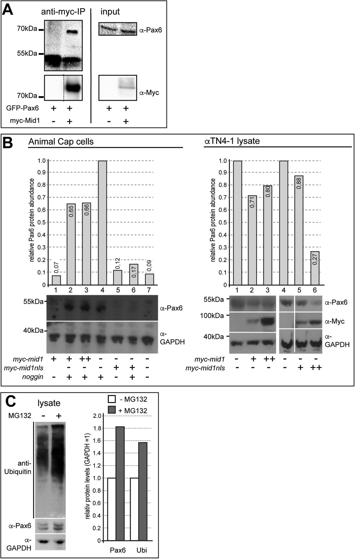 Fig. S2. Mid1 reduces endogenous Pax6 protein. (A) Mid1 physically interacted with Pax6. HEK293 cells were transfected with GFP-pax6 + myc-mid1 or myc-mid1 alone. The left panels show eluted Pax6 protein after immunoprecipitation with an anti-Myc antibody (upper blot) and precipitated myc-Mid1 (lower blot, reprobe with anti-Myc antibody). The right panels show blots with the respective lysates for the input proteins. (B) Xenopus animal cap explants expressed Pax6 upon neuralization by microinjection of 400 μg synthetic RNA of the BMP4 inhibitor noggin. Approximately 30 animal cap explants were separated in each lane. Coinjection of Xenopus mid1 RNA (1 ng) led to a reduction of Pax6 protein abundance. The reduction of Pax6 protein levels was considerably stronger, when Mid1 protein was forced to enter the nucleus by the fusion of a nuclear localization signal (mid1nls). The mouse lens epithelial cell line αTN4-1 expresses pax6 endogenously. Transfection of mid1 and of mid1nls led to a reduction of endogenous Pax6 protein. Corresponding Western blots were quantified with the help of ImageJ and normalized against GAPDH. (C) Pax6 levels increased upon proteasome inhibition. αTN4-1 cells were grown in DMEM medium (10% FCS) and were treated with DMSO (â) or with MG132 (5 μM) (+). Pax6 levels increased upon MG132 treatment (+), as well as polyubiquitinated proteins. Anti-GAPDH was used as a loading control. Densitometry was performed using ImageJ (right graph). |