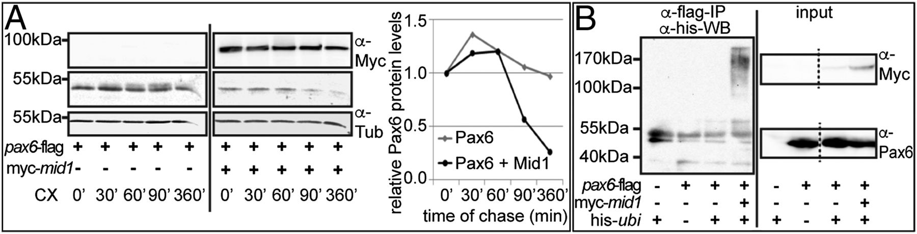 Fig. 3. Mid1 induces ubiquitination and reduces the abundance of Pax6 protein. (A) Blots show levels of Pax6, Mid1, and β-tubulin in HEK293 cells after cotransfection on pax6-flag expression plasmid and either EV or myc-mid1 at different time points (min) on cycloheximide block of protein synthesis. Diagram shows the quantified values of Pax6 protein relative to β-tubulin levels in Western blot. Amounts of Pax6 protein before the cycloheximide treatment are designated as 1 (100%). (B) In vivo ubiquitination of Pax6 was analyzed by transfection of HEK293 cells with plasmids coding for pax6-flag, myc-mid1, and his-ubiquitin as indicated and anti-his Western blot of proteins eluted after an anti-flag-IP (Left). Input of the proteins was verified by Western blot of the corresponding lysates with anti-Myc and anti-Pax6 antibodies, respectively (Right). |