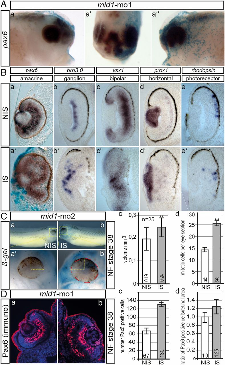 Fig. 4. Mid1 loss of function interferes with eye development. (A and B) 2.5 pmol of mid1-mo1 was injected into one cell at the two-cell stage and analyzed by Wmish at NF stage 38. (Upper) Lateral views of head region of noninjected (a; NIS) or injected side (aâ²; IS), dorsal view (aâ²). (B) Analysis of retinal stratification on mid1 suppression in transversal sections at the level of the lens using probes against pax6, brn3.0, vsx1, prox1, and rhodopsin. For better comparison, all images are oriented with the lens to the left. (C) Lateral view (a and b) of NF stage 38 embryos injected with mid1-mo2 into one cell at the two-cell stage and 10Ã enlarged view of the eye region of aâ² and bâ² (Lower). All mid1-mo2âinjected embryos showed an increase in eye size (n = 212 mid1-mo2 and n = 126 ctrl-moâinjected embryos). The graph shows the mean values for 25 embryos (c; **P = 0.001). Analysis of cell proliferation of mid1-mo2âinjected embryos. The number of phospho-histone H3 (pH3) positive cells were counted and compared. (d; ctrl-mo: six embryos, mean 14.4 pH3+ cells per section; mid1-mo2: eight embryos, mean 27.2 pH3+ cells per section; ***P = 0.0006). (D) Pax6 immunoreactivity in cryosections on mid1-mo1 injection. The number of Pax6-positive cells per sections within the retinal region was counted for both sides of two embryos, and the area of the total retina was estimated. The numbers of Pax6-positive cells from sections of three mid1-mo1âinjected embryos were counted (c; *P = 0.03); the numbers of Pax6-positive cells relative to the area of the retina is shown in the right diagram (d). The value for the noninjected side was set to 1. |