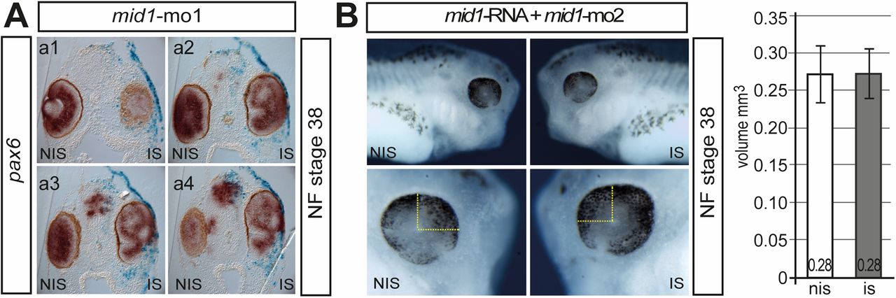 Fig. S3. (A) a1âa4 show a series of transversal sections at the level of the eye of the mid1 injected tadpole (NF stage 38) shown in Fig. 1 A, a. (B) Rescue of the mid1 knockdown eye phenotype. Lateral view of NF stage 38 embryos injected with mid1-mo2 (1.25 pmol) along with synthetic human mid1 RNA (1â2 ng) into one cell of a 2-cell stage embryo. The lower panel shows a 10Ã enlarged view of the respective eye region. Considering the eye to be an oblate spheroid, the mean radius was estimated by measuring the drawn distances and total volume was calculated. The graph shows the mean values for 20 embryos. The specificity of the pax2 and pax6 morpholino had been tested already by rescue experiments in refs. 53 and 54, respectively. |
