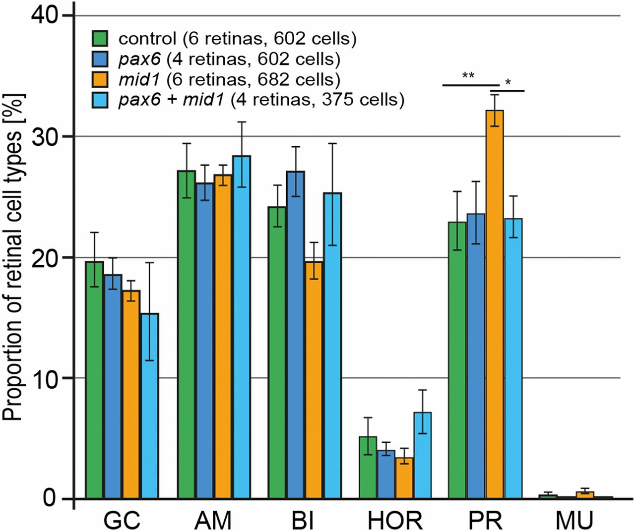 Fig. 5. Targeted overexpression of mid1 affects fate of retinal precursor cells, which can be reversed by pax6 coexpression. Cell fate analysis at stage 41 following overexpression of the indicated constructs by in vivo lipofection at the neurula stage. GFP was used as a tracer to visualize transfected cells. The error bars represent SEM. AM, amacrine cells; BI, bipolar cells; GC, ganglion cells; HOR, horizontal cells; MU, Müller cells; PR, photoreceptor cells. |