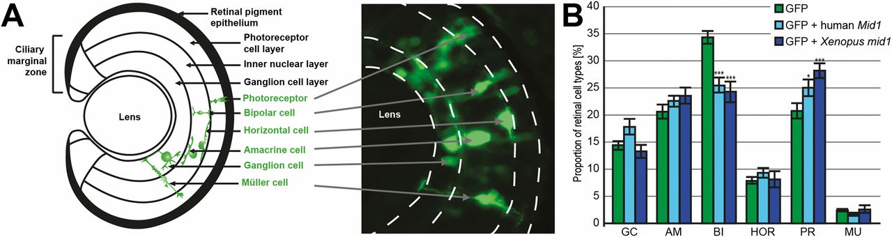 Fig. S4. Human and Xenopus mid1/Mid1 affects fate of retinal precursor cells similarly. (A) Schematic of the retina showing the different cellular layers and retinal cell types. The picture on the right illustrates a clone of GFP-positive cells following lipofection. Cell types are identified according to their position in the layers and their morphology. (B) Human or Xenopus mid1 expression plasmids together with GFP or GFP plasmid alone were lipofected into the area of the eye prospective retinal field at NF stage 17. At NF stage 41, cryosections were done, and the fluorescent cells in the central retina were counted. The different cell types were identified according to their morphology. The diagram shows the percentages of the different cell types for GFP-lipofected embryos (green, n = 40), human Mid1 (light blue, n = 24), and Xenopus mid1 (dark blue, n = 17); error bars represent SEM. AM, amacrine cells; BI, bipolar cells; GC, ganglion cells; HOR, horizontal cells; MU, Müller cells; PR, photoreceptor cells. |