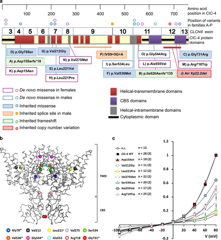 Variants in CLCN4, which encodes the chloride/hydrogen ion exchanger CIC-4 prominently expressed in brain, were recently described to cause X-linked intellectual disability and epilepsy. We present detailed phenotypic information on 52 individuals from 16 families with CLCN4-related disorder: 5 affected females and 2 affected males with a de novo variant in CLCN4 (6 individuals previously unreported) and 27 affected males, 3 affected females and 15 asymptomatic female carriers from 9 families with inherited CLCN4 variants (4 families previously unreported). Intellectual disability ranged from borderline to profound. Behavioral and psychiatric disorders were common in both child- and adulthood, and included autistic features, mood disorders, obsessive-compulsive behaviors and hetero- and autoaggression. Epilepsy was common, with severity ranging from epileptic encephalopathy to well-controlled seizures. Several affected individuals showed white matter changes on cerebral neuroimaging and progressive neurological symptoms, including movement disorders and spasticity. Heterozygous females can be as severely affected as males. The variability of symptoms in females is not correlated with the X inactivation pattern studied in their blood. The mutation spectrum includes frameshift, missense and splice site variants and one single-exon deletion. All missense variants were predicted to affect CLCN4's function based on in silico tools and either segregated with the phenotype in the family or were de novo. Pathogenicity of all previously unreported missense variants was further supported by electrophysiological studies in Xenopus laevis oocytes. We compare CLCN4-related disorder with conditions related to dysfunction of other members of the CLC family.
