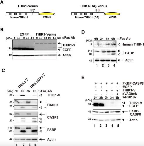 Fig. 2. Immunoblot analyses of proteolytic processing of THIK-1 in dying cells. (A) A schematic diagram of constructs. THIK1-Venus and THIK1(DA)-Venus are fusion proteins consisting of mouse THIK-1 and a fluorescent protein, Venus. THIK1(DA)-Venus is a mutant with the IETD sequence replaced by IETA. Gray boxes indicate transmembrane regions. (B) Immunoblot analysis of the cleavage of THIK-1 during apoptosis. Cell extracts from HeLa cells expressing EGFP or THIK1-Venus were prepared at the indicated times after Fas ligation. A cleaved fragment containing the C-terminal portion of THIK-1 fused with Venus was detected by immunoblotting with an anti-GFP antibody. Arrows indicate intact proteins while a white arrowhead identifies the cleaved fragments. (C) Detection of sequence-specific processing of THIK-1. Cell extracts from HeLa cells expressing THIK1-Venus or THIK1(DA)-Venus were prepared at the indicated times after Fas ligation. The cleaved fragment containing the C-terminal portion of THIK-1 fused with Venus was detected by immunoblotting with an anti-GFP antibody. Endogenous CASP8, CASP3, PARP, and actin were also examined by immunoblotting with suitable specific antibodies. (D) Detection of the cleaved fragment of endogenous THIK-1. Cell extracts from HeLa cells were prepared at the indicated times after Fas ligation. A cleaved fragment consisting of the C-terminal 78 amino acids of human THIK-1 was detected by immunoblotting with an anti-human THIK-1 antibody. (E) Detection of the processing of THIK-1 by AP20187-induced active CASP8. Cell extracts from MCF-7 cells expressing EGFP or THIK1-Venus together with FKBP-CASP8 were prepared at the indicated times after the addition of AP20187. As a control, half of the transfectants expressing THIK1-Venus were co-incubated with zVAD-fmk. |