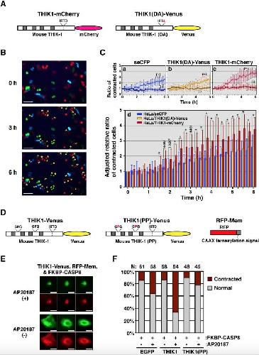 Fig. 3. Promotion of cell shrinkage in THIK-1-overexpressing cells. (A) A schematic diagram of the construct. THIK1-mCherry is a fusion protein consisting of mouse THIK-1 and a fluorescent protein, mCherry instead of Venus. Gray boxes indicate transmembrane regions. (B) Morphological analysis of HeLa cells expressing THIK1-mCherry, THIK1(DA)-Venus, or control seCFP during apoptosis. Fluorescence images of transfectants treated with an anti-Fas antibody were captured at indicated times using a cellular fluorescence image analyzer. Asterisks indicate contracted cells. Scale bar indicates 100 μm. (C) The effect of THIK-1 on cell shrinkage in apoptotic induction. HeLa cells expressing seCFP (panel a), THIK1(DA)-Venus (panel b), or THIK1-mCherry (panel c) in the same field were automatically examined with the instrument for morphological contraction in the presence (+) or absence (â) of anti-Fas antibody. The relative ratio of contracted cells detected by Fas-ligation to contracted cells without treatment is summarized in panel d. Data are representative of two independent experiments and presented as the means and standard deviations of samples counted from six different fields in the plate. Student's t-test was performed between seCFP- and THIK1-mCherry-expressing cells. Asterisks show p < 0.05. (D) A schematic diagram of the construct. THIK1(PP)-Venus is a channel-inactive THIK-1 mutant generated by exchanging both phenylalanine residues, which localize in the pore segment essential for the current of potassium ions, with prolines. Gray boxes indicate transmembrane regions. RFP-Mem, which consists of a RFP fused with the Ha-ras farnesylation CAAX sequence, localizes on the plasma membrane. (E) Morphological analysis of MCF-7 cells expressing THIK1-Venus together with both FKBP-CASP8 and RFP-Mem proteins after incubation with or without a dimerizer, AP20187. Both yellow and red fluorescence images of transfected cells were captured by fluorescence microscopy. Scale bar indicates 20 μm. (F) A summary of the morphological analysis. The numbers of both RFP- and Venus-positive cells displaying either a normal (gray) or a contracted (red) shape were counted under the microscope, and the corresponding percentages were calculated. N indicates the total number of transfected cells examined in three independent experiments. |