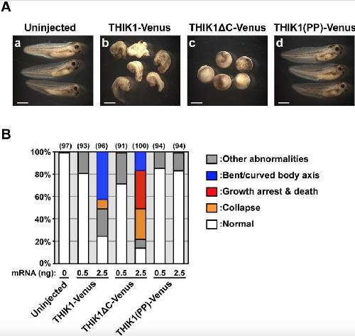 Fig. 9. In vivo assessment of the effects of the truncated form of THIK-1 in the developing Xenopus embryos. (A) The morphology of developing embryos subjected to mRNA microinjection. Uninjected embryo (panel a) and THIK1-Venus (panel b), THIK1ÎC-Venus (panel c), or THIK1(PP)-Venus (panel d) mRNA-injected embryos were allowed to develop to stage 38 and photographed under a stereo microscope. Scale bars represent 1 mm. (B) A summary of the morphological analysis. The numbers of embryos displaying normal (white), growth arrest and death (red), bent/curved body axis (blue), and other uncharacterized abnormalities (gray) were counted under the microscope and those percentages were calculated. The numbers of collapsed embryos (orange) were estimated by subtraction of embryos counted at stage 38 from embryos counted at stage 11. The number in parentheses indicates the total number of embryos examined in three independent experiments. |