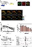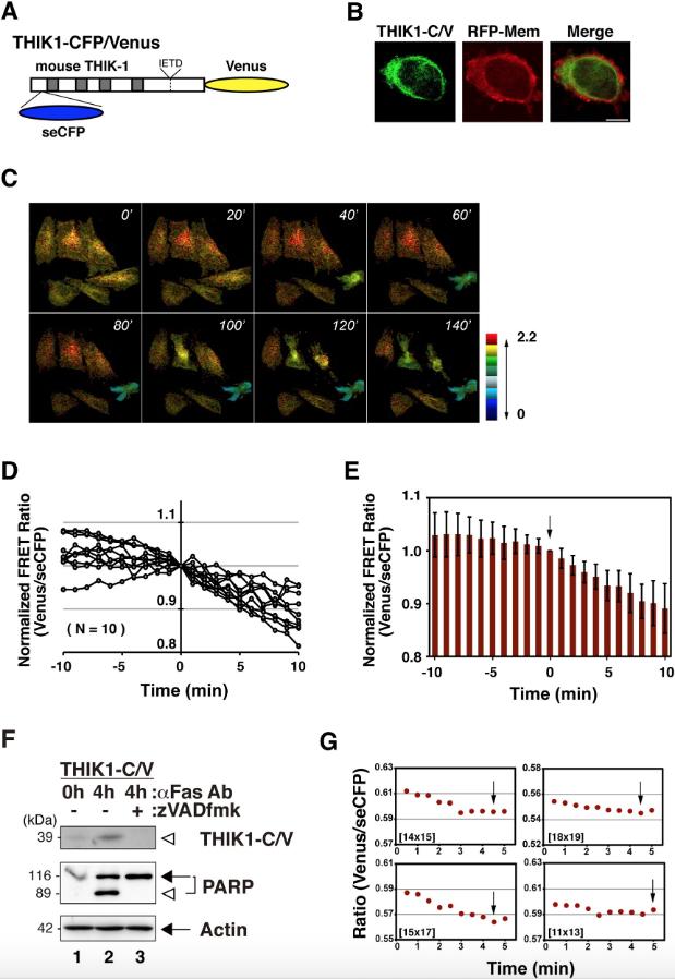 Fig. 4. Monitoring of the structural alterations of THIK-1 during apoptosis. (A) A schematic diagram of the constructs. THIK1-CFP/Venus is a variant with seCFP inserted into the N-terminal cytoplasmic region of THIK1-Venus. (B) Cellular localization of THIK1-CFP/Venus. The fluorescent images of HeLa cells expressing both THIK1-CFP/Venus and RFP-Mem proteins were captured through green and red fluorescence channels using a confocal microscope, and representative and merged images are displayed. Scale bar indicates 10 μm. (C) The structural alteration of THIK-1 during apoptosis was monitored by cytological analysis. A series of fluorescence emission ratio images (Venus/seCFP) of dying cells are displayed in intensity-modulated display mode, where warmer hues indicate a higher Venus/seCFP ratio or higher FRET efficiency, and brightness indicates the intensity of the Venus channel. Numbers in each panel indicate time after taking the first image. (D) The adjusted profiles of FRET ratios before and after cell shrinkage. Normalized FRET ratios were plotted over a time frame 10 min before and after cell shrinkage, based on time courses from single cells. Time zero indicates the moment when cell shrinkage began. N indicates the number of cells examined. (E) A summary of the FRET analysis. The bar graph indicates the means and standard deviations based on the data in (D). The arrow indicates the beginning of cell shrinkage. (F) Detection of the caspase-specific cleavage of THIK1-CFP/Venus. Cell extracts from HeLa cells expressing THIK1-CFP/Venus were prepared at the indicated times after Fas ligation. As a control, half of the transfectants were co-incubated with zVAD-fmk. The cleaved fragments were detected by immunoblotting with an anti-GFP antibody. PARP and actin were also examined by immunoblotting with suitable specific antibodies. Arrows indicate intact proteins while white arrowheads identify the cleaved fragments through all experiments. (G) The graphical representation of the FRET ratio of HeLa cells expressing THIK1-CFP/Venus during apoptosis. The time course runs 5 min before and after cell shrinkage. The temporal fluctuations of the Venus/seCFP ratio in four single cells are plotted in each panel. The arrow indicates the beginning of cell shrinkage, and the numbers in parentheses indicate the pixel size selected for detection. |