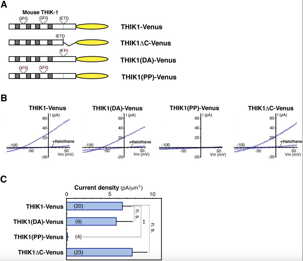 Fig. 6. Physiological function analysis of THIK-1 as a potassium channel. (A) A schematic diagram of the constructs. THIK1 â C-Venus is a truncated form lacking the HAMP-like domain. THIK1(DA)-Venus and THIK1(PP)-Venus are the same as shown in Figs. 2A and 3D, respectively. Gray boxes indicate transmembrane regions. (B) Representative current recordings of THIK-1 and its mutants. The current-voltage (IV) relationships of transfectants expressing either THIK1-Venus, THIK1(DA)-Venus, THIK1(PP)-Venus, or THIK1 â C-Venus were measured from â 120 mV to 60 mV using the inside-out patch-clamp technique. In Cos-7 transfectants expressing either THIK1-Venus, THIK1(DA)-Venus, or THIK1 â C-Venus, the IV were also measured in the presence of 1.75 mM halothane. (C) A summary of the data in (B) is presented. Data measured at â 60 mV are indicated as means with standard error of the mean. Numbers in parentheses indicate the numbers of cells examined. Statistical validation was performed by Student's t-test. A double asterisk shows p < 0.01 and n.s. is not significant. |
