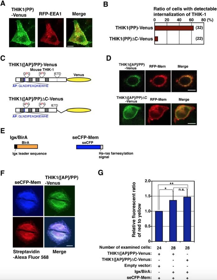Fig. 8. Subcellular localization of mutant and truncated THIK-1. (A) Detection of endocytosis of THIK1(PP)-Venus by confocal microscopic analysis. The images of HeLa cells expressing both THIK1(PP)-Venus and RFP-EEA1 proteins were captured through green and red fluorescence channels using a confocal microscope, and representative and merged images are displayed. Scale bar indicates 10 μm. (B) A summary of the assessment of THIK-1 internalization. The numbers of transfected cells displaying overlap of green and red fluorescence were counted under the microscope and those percentages were calculated. Numbers in parentheses indicate the numbers of transfected cells examined in two independent experiments. (C) A schematic diagram of the constructs. Both THIK1([AP]/PP)-Venus and THIK1([AP]/PP)âC-Venus contain the AP amino acid acceptor sequence (GLNDIFEAQKIEWHE) in the first extracellular loop domain. (D) Membrane expression of the modified THIK-1 proteins. The fluorescence images of HeLa cells expressing either THIK1([AP]/PP)-Venus or THIK1([AP]/PP)âC-Venus with RFP-Mem were captured through green and red fluorescence channels using a confocal microscope, and representative and merged images are displayed. Scale bar indicates 10 μm. (E) A schematic diagram of the constructs. Igκ/BirA expressed in cells is able to biotinylate THIK-1 carrying the AP sequence. seCFP-Mem carrying the Ha-ras farnesylation sequence was generated for labeling of the plasma membrane. (F) Detection of THIK1([AP]/PP)-Venus localizing on the cell surface by microscopy. The images of HeLa cells expressing seCFP-Mem, THIK1([AP]/PP)-Venus, and Igκ/BirA were captured through blue, green, and red fluorescence channels using a confocal microscope, and the representative and merged images are displayed. Scale bar indicates 10 μm. (G) Comparison of the expression levels of THIK1([AP]/PP)-Venus and THIK1([AP]/PP)âC-Venus proteins on the cell surface. Both yellow (Venus) and red (Alexa Fluor 568) fluorescence images of CFP-positive cells were captured by microscopy and the fluorescence ratio of red to yellow was estimated using MetaMorph software. Note that even in BirA-nonexpressing transfected cells, the red fluorescent dye conjugated to streptavidin nonspecifically bound to the cell surfaceâred fluorescence was detectable at a high background level. A total of twenty-four to twenty-eight transfected cells were examined in four independent experiments. Statistical validation was performed by Student's t-test. A single asterisk indicates p < 0.05, a double asterisk shows p < 0.01, and n.s. is not significant. |