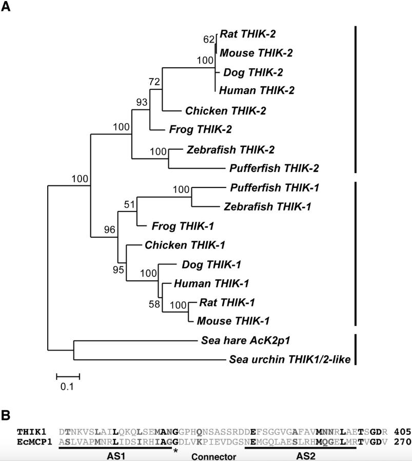 Fig. S1. Molecular phylogenetic analysis of THIK proteins. (A) Based on amino acid sequences cited from the NCBI and Ensembl databases, a molecular phylogenetic tree of THIK-1, THIK-2 and THIK1/2-like molecules of several animals was constructed by the maximum likelihood method based on an alignment generated with the T-Coffee program [1]. The number noted at branches indicates the percentage of each node that was supported in 100 bootstrap pseudo-replicates. The scale bar indicates an evolutionary distance of 0.1 amino acid substitutions per position. (B) The alignment of the THIK-1 HAMP-like domain and the HAMP domain of E. coli methyl-accepting chemotaxis protein I (MCP-I) (UniProtKB: P02942). Identical or similar amino acids are indicated in bold black or bold dark gray, respectively. Two amphipathic α-helices (AS1 and AS2) and a connector are shown under the amino acid sequence, based on a previous study [4]. The asterisk indicates a conserved Gly in all HAMP domains. |