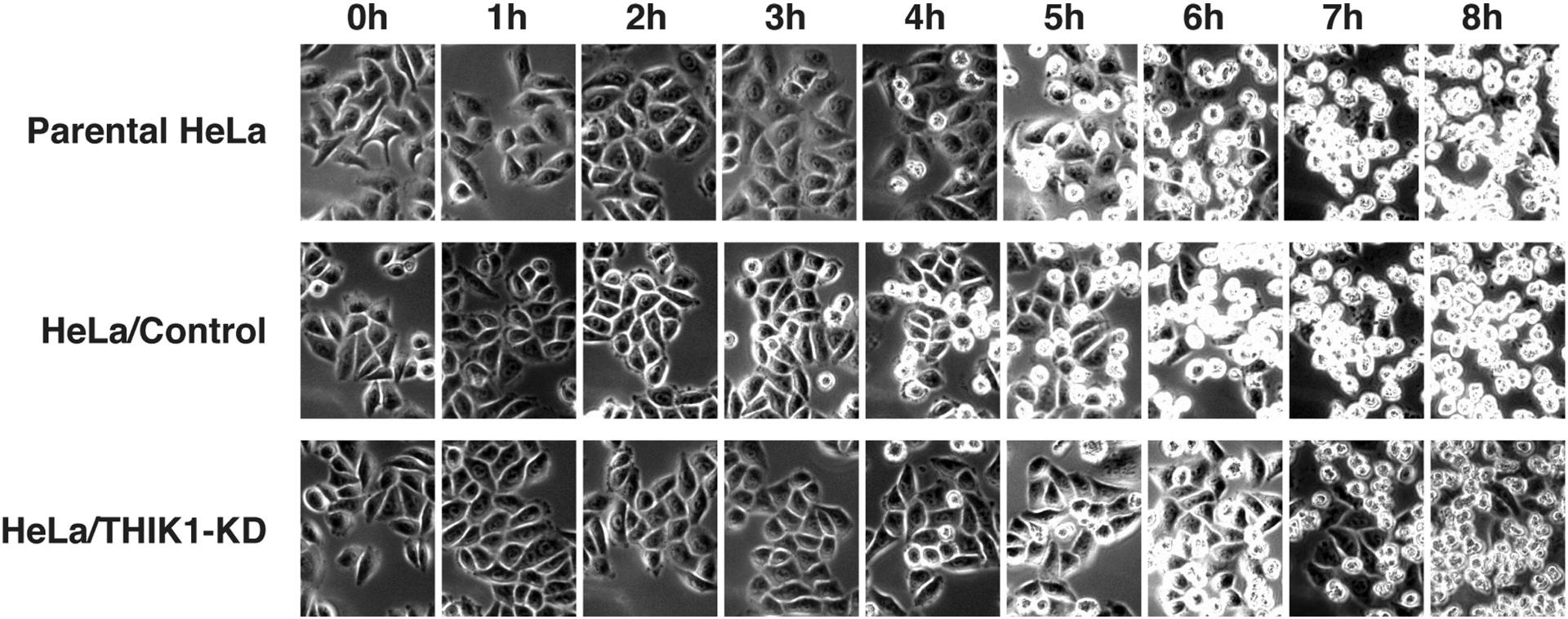 Fig. S3. Morphological observation of THIK-1-knockdown cells during apoptosis. After addition of anti-Fas antibody, parental HeLa cells and stable transfectants carrying plasmids, either pSilencer (Control) or pSi-shTHIK1 (THIK1-KD) were monitored for morphological changes every hour for a duration of 8 h. Representative microscopic images from the indicated time points are shown. |