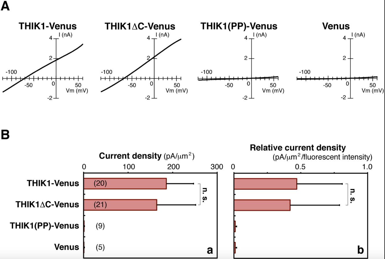 Fig. S5. Examination of K+ efflux through THIK-1, THIK1 â C, and THIK1(PP) with a cell-attached configuration. (A) Representative current recordings of THIK-1 and its mutants. The current-voltage (IV) relationships of Cos-7 transfectants expressing either Venus, THIK1-Venus, THIK1 â C-Venus, or THIK1(PP)-Venus were measured from â 120 mV to 60 mV using the whole-cell patch-clamp technique. (B) A summary of the data in (A) is presented. Both the data (panel a) and the compiled data based on the fluorescence intensity of Venus in cells (panel b) measured at â 0 mV are indicated as means with SEM, respectively. Numbers in parentheses indicate the numbers of cells examined. Statistical validation was performed by Student's t-test. n.s. is not significant. |