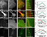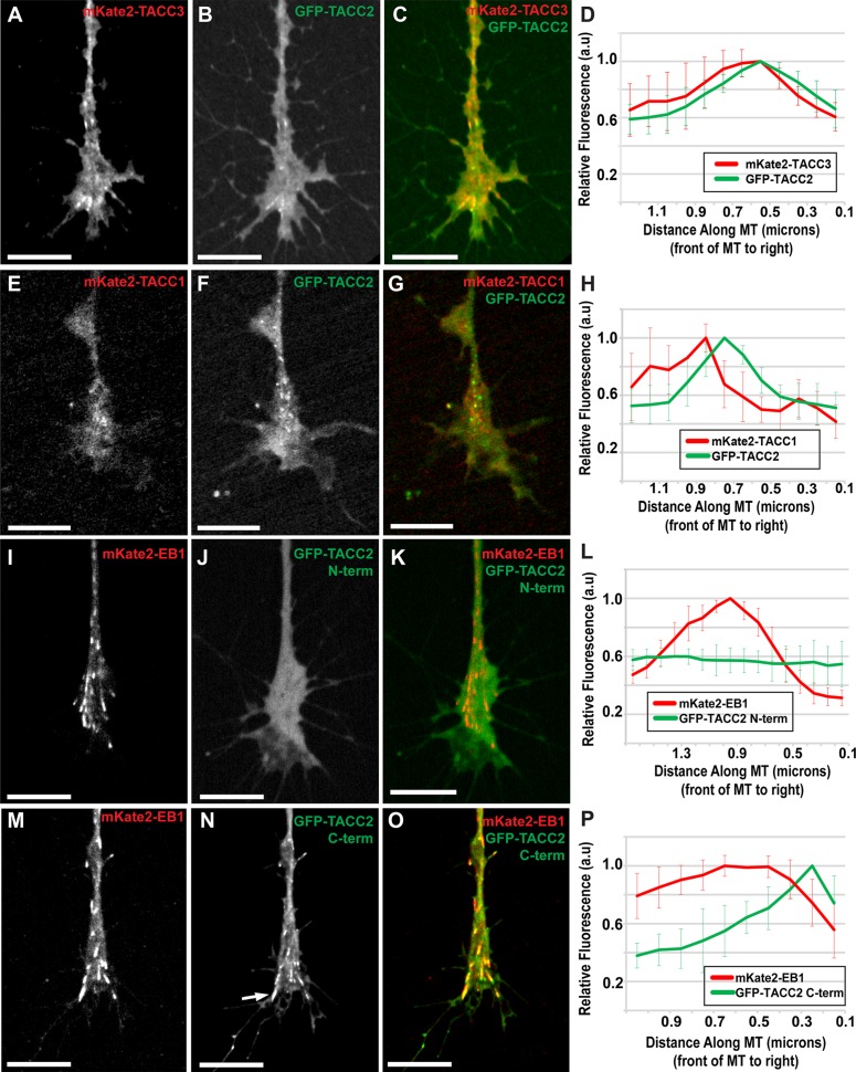 FIGURE 2:. TACC2 localizes to the plus end through its C-terminal domain and overlaps with both TACC1 and TACC3. (AâC) Representative images of mKate2-TACC3, GFP-TACC2, and merged in cultured neuronal growth cones. (D) Fluorescence intensity profiles of GFP-TACC2 and mKate2-TACC3. (EâG) mKate2-TACC1, GFP-TACC2, and merge with GFP-TACC2 fluorescence intensity plot profile (H). (IâK) Images of mKate2-EB1, GFP-TACC2 N-term (aa 1â540), and merged with the plot of fluorescence intensity profiles (L). (MâO) Images of mKate2-EB1, GFP-TACC2 C-term (aa 923-1168), and merged with the plot showing their fluorescence intensity profiles (P). Arrow in N points to lattice binding of TACC protein. Time interval between all frames is â¼2 s. For D, the green plot profile was translated â¼0.2 μm left (MT plus-end velocity â¼0.124 μm/s, green channel imaged 1.5 s after red) to accurately represent relative localization. For H, the green profile was translated left based on the velocity of each comet measured to account for difference in acquisition time points between channels (green channel imaged 1.5 s after red). In P, the green profile was translated 0.1 μm (MT plus-end velocity â¼0.148 μm/s, red channel imaged 0.96 s after green). For all fluorescence intensity profiles, â¼10 MTs for each condition were quantified by intensity line scans, and SDs are shown in error bars. MT plus end is at the right. Scale bars, 10 μm. |