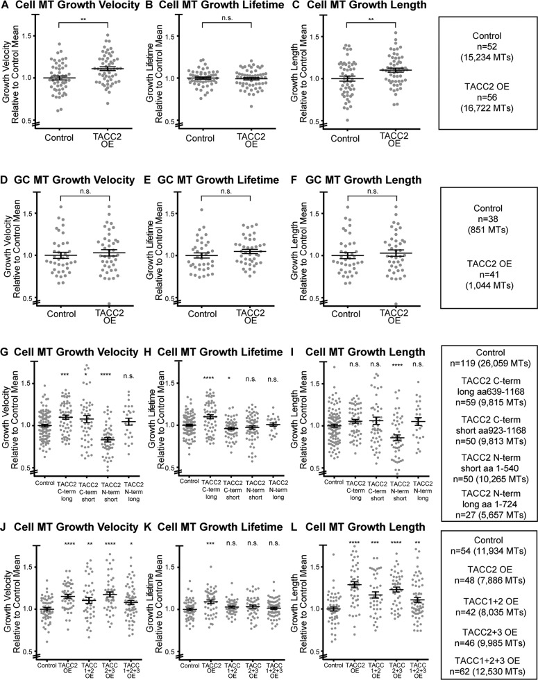 FIGURE 3:. TACC2 can regulate microtubule plus-end dynamics through its C-terminal domain in a cell typeâspecific manner. All raw data of automated tracking of mKate2-EB1 comets were normalized to the same-day control means, and all reported values are relative ones combined over at least three separate experiments. (AâC) Quantification of mean values of MT parameters (velocity, lifetime, length) upon TACC2 OE in embryonic mesenchymal cells. (DâF) MT parameters in growth cones (GC). (GâI) MT parameters in mesenchymal cells on overexpression of C- or N-terminal-truncated TACC2. (JâL) Quantification of MT parameters in mesenchymal cells when multiple combinations of TACC family members were expressed. Bars on dot plots show mean and SEM. To assess statistical significance, ANOVA tests were first performed (for multiple conditions), followed by an unpaired t test. ****p < 0.0001, ***p < 0.001, **p < 0.01, *p < 0.05, n.s., not significant. |