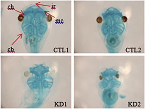 Loss of SRSF1 induces microcephaly by abnormal formation of braincartilage. Alcian blue staining was performed to show cartilage formation. SRSF1 MO-injected embryos showed abnormal cartilage shapes, such as cb, ch, ir, and mc (red arrows) compared to those of control MO-injected embryos; cb = ceratobranchial, ch = ceratohyal, ir = infrarostral, mc = Meckelâs cartilage. (For interpretation of the references to colour in this figure legend, the reader is referred to the web version of this article.)