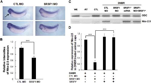 SRSF1 regulates heart development through the regulation of Nkx-2.5 expression. (A) Expression of Nkx-2.5 was detected by whole-mount in situ hybridization. Stage 32 tadpoles were fixed in MEMFA for this experiment. SRSF1 morphants showed significant downregulation of Nkx-2.5 expression. (B) The graph showed the expression level of Nkx-2.5 in each experiment. Expression of Nkx-2.5 in stage 32 embryos, detected by whole-mount in situ hybridization, was slightly reduced (approximately 30%) in SRSF1 MO-injected groups. ***p < 0.001 compared with control MO-injected. (C) Expression of Nkx-2.5 was detected by RT-PCR in stage 16 whole embryos or isolated animal caps injected with DNBR. (D) The graph exhibited only DNBR-induced Nkx-2.5 expression in stage 16 animal caps. In stage 16 embryos, expression of Nkx-2.5, detected by RT-PCR, was dramatically reduced in SRSF1-injected embryos (approximately 70%). ***p < 0.001 compared with control MO-injected and SRSF1*-injected.