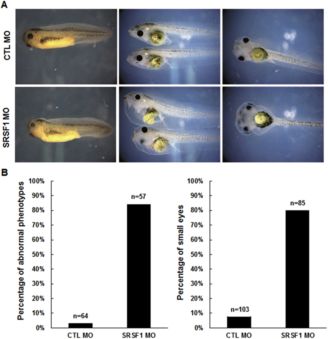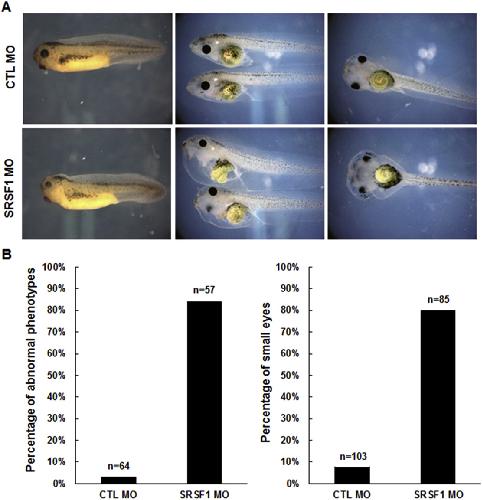 SRSF1-depleted embryos show abnormal organ development, especially in head formation, gut looping, and edema in the heart. (A) SRSF1-depleted embryos did not show significant malformation of organs until the tail bud stages. The first traits of SRSF1 morphants were detected at stage 33 tadpoles, in the period of eye development (left). At stage 45, SRSF1-depleted tadpoles showed abnormal phenotypes such as edema in the head and heart and miscoiled intestines. (B) Graphs show the percentage of tadpoles that showed abnormal development in the test groups. More than 80% of tadpoles showed loss-of-SRSF1 phenotypes at stages 33 and 45.