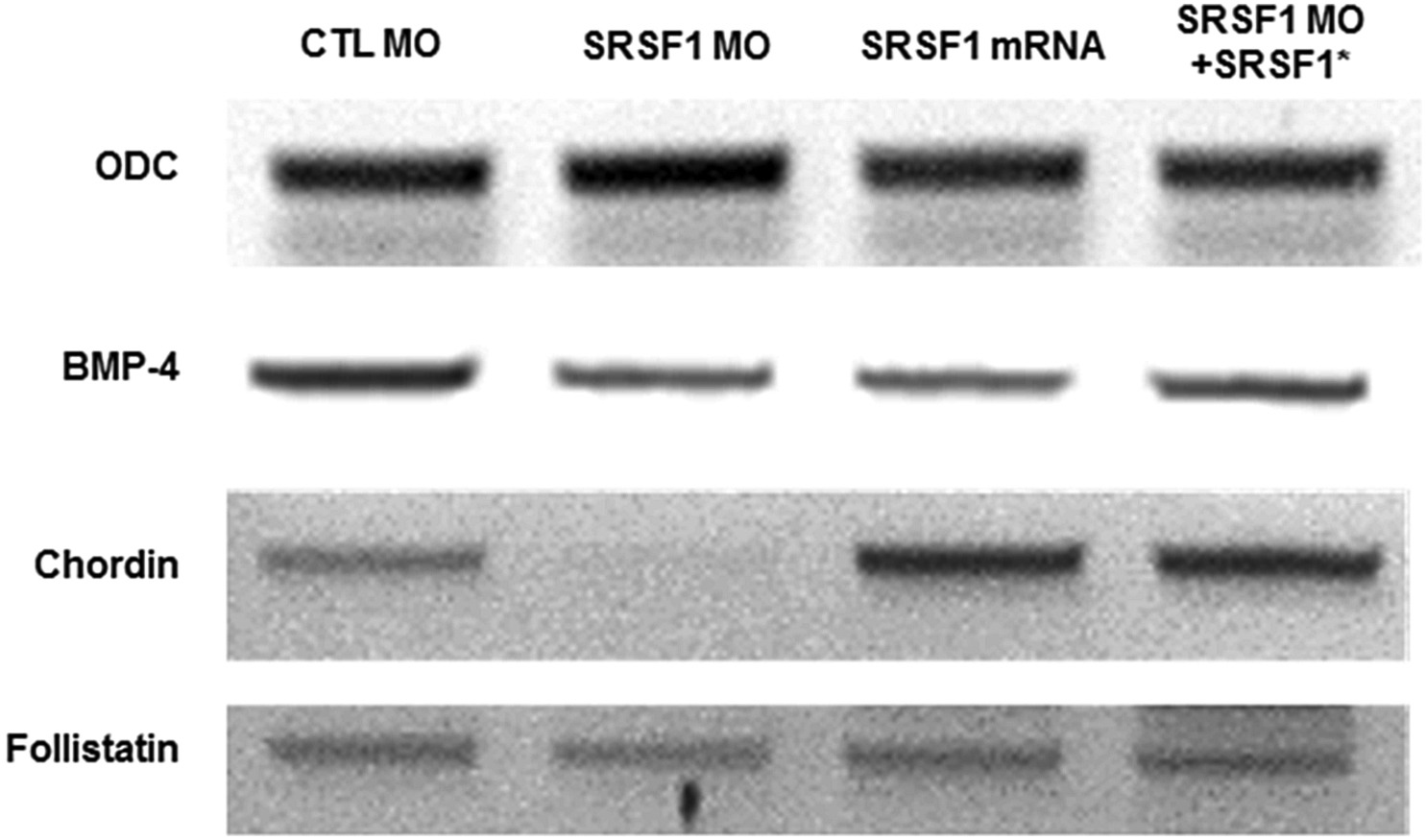 Loss of SRSF1 dramatically reduces the transcription of chordin. We performed RT-PCR to show the expression of BMP-4 signaling-related molecules in SRSF1 MO-injected embryos. In the SRSF1 MO-injected groups, only chordin RNA was down-regulated, while other BMP-4 signaling-related molecules such as BMP-4 and follistatin were not changed.