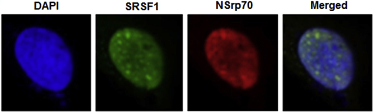 Exogenous Xenopus SRSF1 is expressed in nuclear speckles. Exogenously expressed Xenopus SRSF1 proteins were localized in the nucleus, especially in the nuclear speckles in HeLa cells. NSrp70 was used as a control because it is a known nuclear speckle protein and interacts with SRSF1 physiologically. (Blue: DAPI, Green: SRSF1, Red: NSrp70). Immunohistochemistry was performed to show localization.