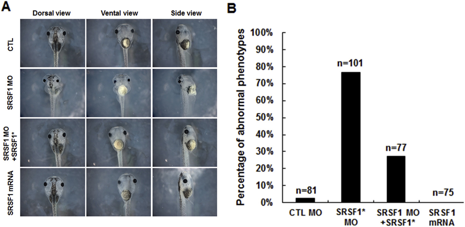 SRSF1 MO-induced abnormal phenotypes are specific and rescued by knock-in of exogenously expressed RNAs. (A) In order to rescue the defects of SRSF1 MO, SRSF1* RNA (SRSF1 Res), which is resistant to SRSF1 MO, was co-injected with SRSF1 MO. SRSF1* RNA (400 pg) was injected and did not affect embryogenesis (third row panels). Furthermore, embryos injected with 400 pg of SRSF1* RNA with SRSF1 MO showed partially rescued phenotypes at stage 45 tadpoles (bottom panels). (B) The histogram shows the percentage of tadpoles with abnormal phenotypes among SRSF1 MO and rescued tadpoles. Approximately 50% of the failed development in tadpoles was restored in the rescued groups.