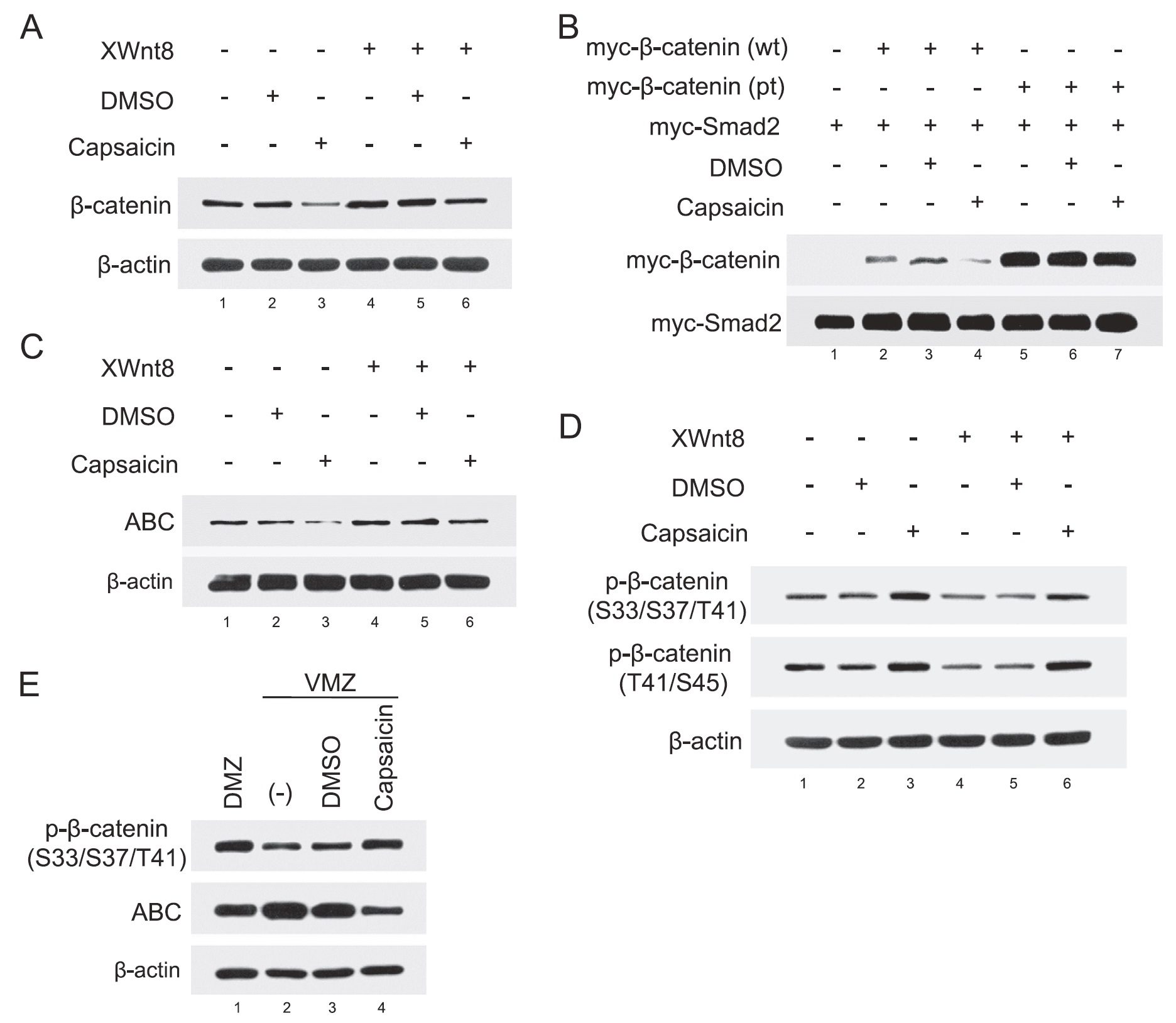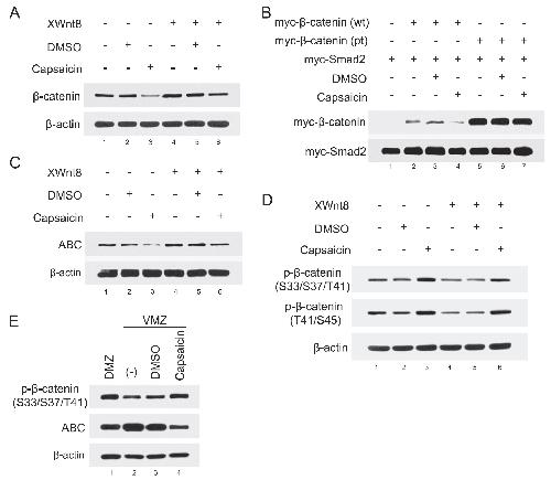 Fig. 3. Capsaicin affects the phosphorylation state of b-catenin. (AeD) Four-cell stage embryos were injected in the animal pole region with XWnt8 (50 pg) or combinations of mycb-