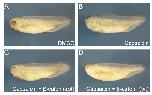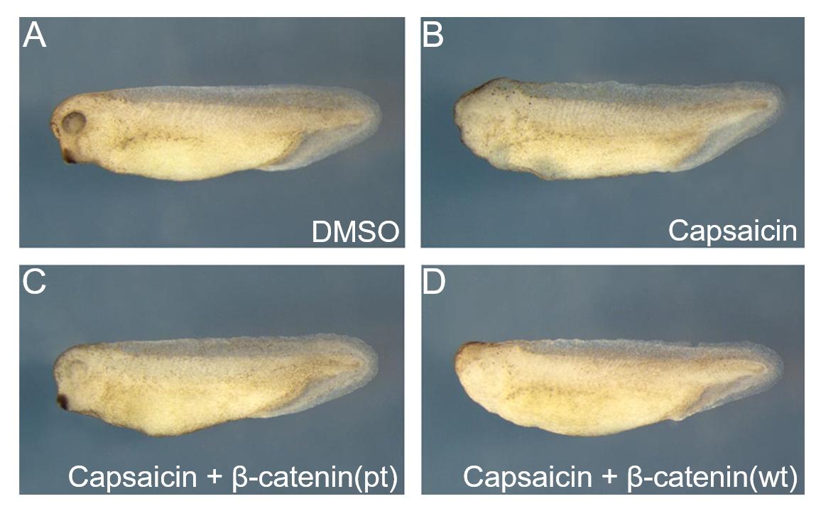 Supplementary Fig. 1. Morphological defects of capsaicin-treated embryos are rescued by co-expression of a non-phosphorylatable β-catenin but not by its wild-type version. Uninjected control embryos and embryos injected at the 4-cell stage dorsally with myc-β-catenin(wt)(20 pg) or myc-β-catenin(pt)(20 pg) RNA were cultured in the presence of capsaicin or DMSO to tadpole stages as indicated. All embryos are shown in lateral views with anterior to the left. The percentages of phenotypes of embryos: (A) 100%, n = 70; (B) 87%, n = 75; (C) 75%, n = 65; (D) 80%, n = 68.
