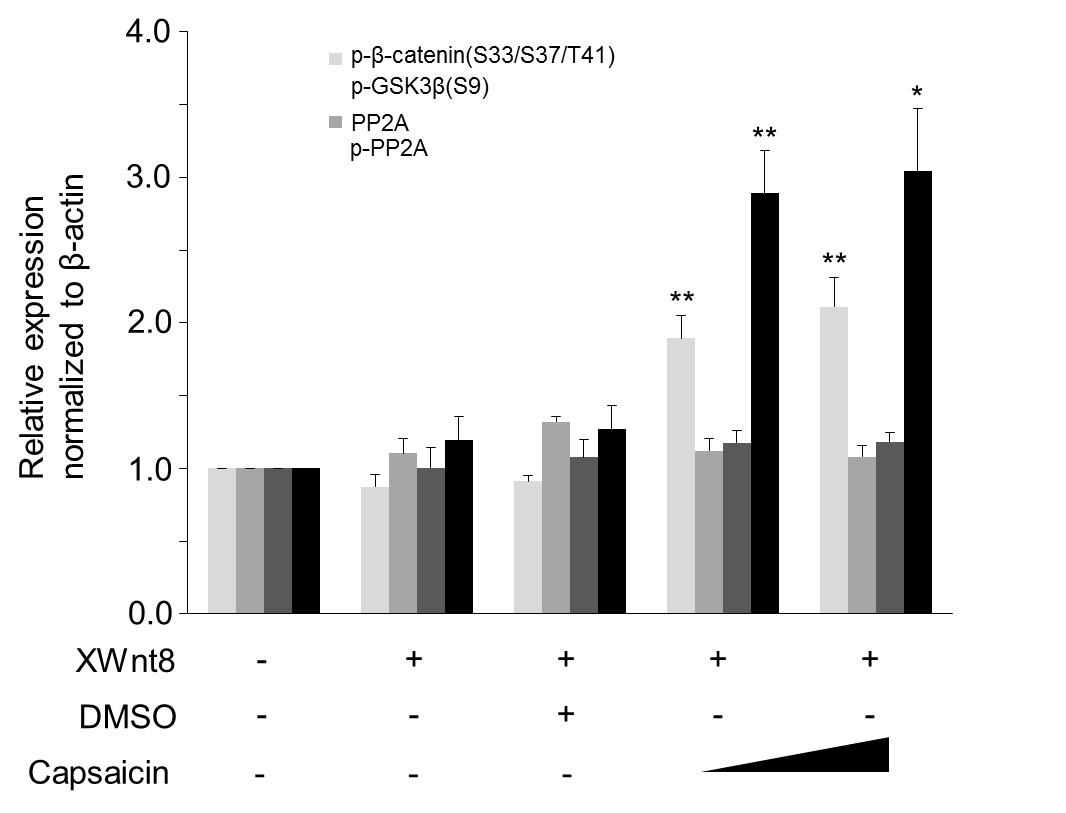 Fig. 4. Capsaicin enhances the phosphorylation of b-catenin by down-regulating the activity of PP2A. (A,C) Four-cell stage embryos were injected animally with XWnt8 (50 pg) RNA