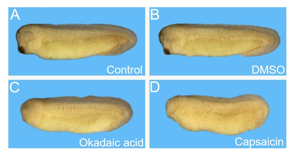 Supplementary Fig. 3. Okadaic acid causes anterior defects in early embryo. Embryos were incubated in media containing DMSO, capsaicin (200 μM) or okadaic acid (300 nM) from 2-cell stage to tadpole stages. All embryos are shown in lateral views with anterior to the left. Control, an embryo with no chemical treatment. The percentages of phenotypes of embryos: (A) 100%, n = 60; (B) 98%, n = 85; (C) 68%, n = 75; (D) 92%, n = 78.