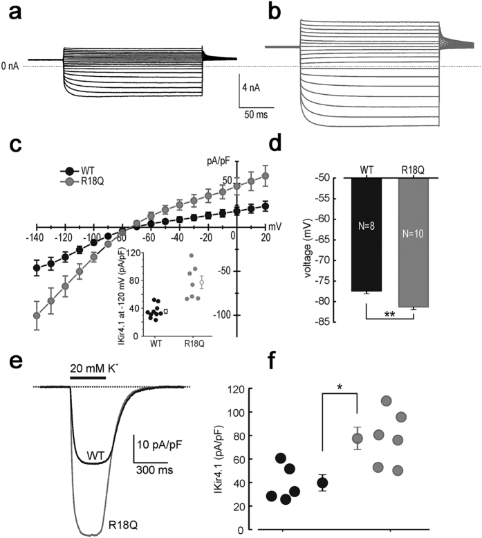 Figure 1. Whole-cell Kir4.1 currents recorded from cells expressing WT and R18Q channels.Sample current traces for (a) WT and (b) R18Q channels expressed in U251 astrocytoma cells, obtained in response to voltage steps from −140 to +20 mV in 10 mV steps, from a holding potential of −30 mV. (c) Mean current density (pA/pF) as a function of voltage obtained from cells expressing the indicated channels. Inset: scatter plot of the single-cell current densities at −120 mV. The open symbols represent the mean ± SEM. (d) The resting membrane potentials were evaluated in current clamp conditions from cells expressing WT (black bar) or R18Q (grey bar) channels (data are mean ± SEM; **p < 0.01). (e) Sample inward-current densities evoked by puffs of an external solution containing 20 mM KCl from astrocytoma cells expressing the indicated channels (holding potential of −80 mV). (f) WT (black circles) and R18Q (grey circles) current densities elicited from each cell using the experimental protocol described in panel e which were subsequently averaged and depicted (mean ± SEM; *p < 0.05). |