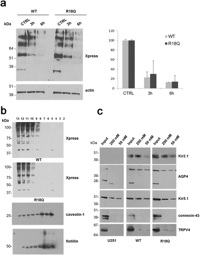 Figure 3. Degradation kinetics, membrane compartmentalization and molecular interactions of WT and R18Q Kir4.1.(a) Left panel: WB analysis of protein extracts obtained from cells expressing WT and R18Q Kir4.1 channels treated with the protein synthesis inhibitor cycloheximide (CHX) for 3 and 6 h to inhibit protein synthesis and evaluate protein degradation kinetic. Anti-Xpress epitope Ab was used to detect WT and mutant Kir4.1. Actin is used as loading control. Molecular weight markers are on the left (kDa). Right panel: densitometric analysis of WT or R18Q Kir4.1 protein bands after CHX treatment, normalized to the corresponding untreated controls, indicates no significant differences in the degradation kinetics between WT and R18Q Kir4.1 proteins. Data are expressed as meanâ±âSEM from three independent experiments. (b) WB analysis of cholesterol-rich (Triton insoluble fractions: 4â7) and cholesterol-poor membrane fractions (Triton soluble fractions: 10â13) obtained from WT or R18Q Kir4.1 expressing cells shows that WT and mutant Kir4.1 channels are both distributed in cholesterol-poor membrane fractions. Caveolin-1 and flotillin identify the caveolar raft fractions in cells expressing Kir4.1 WT. Molecular weight markers are on the left (kDa). (c) WB analysis of Kir4.1 channel interactors selected by Histidine (His) affinity chromatography. Eluates derived from astrocytoma cells infected with the empty vector (U251) were used as controls for unspecific binding to NiNTA-resin. The Input lane indicates the total protein extracts before His pull-down assay and 200âmM and 50âmM the proteins eluted from NiNTA-resin using imidazole (50, 200âmM, respectively). Kir2.1, aquaporin-4 (AQP4), Kir5.1, TRPV4, but not connexin-43 were found among the proteins co-eluted with Kir4.1. No difference was observed between WT and R18Q Kir4.1 interactors. One representative experiment out of four is shown. Molecular weight markers are indicated on the left (kDa). |