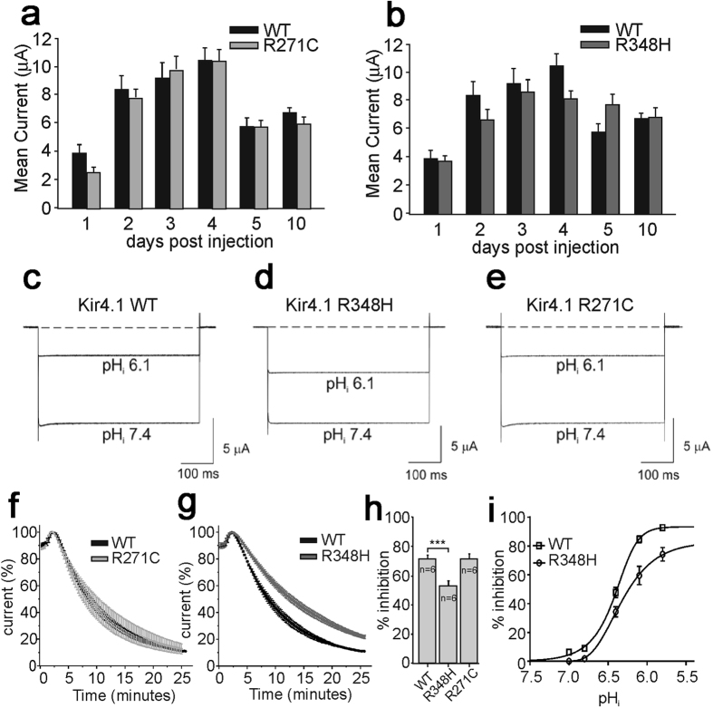 Figure 4. WT, R271C and R348H channels expression pattern and pH-gating in X.laevis oocytes.Mean current amplitudes during 10 days post mRNA injection: (a) WT vs R271C, and (b) WT vs R348H. Sample current traces recorded at pHi 7.4 and 6.1 from WT (c), R348H (d), and R271C (e) expressing oocytes. Time course of current inhibition (%) of R271C vs WT (f), and R348H vs WT (g) upon K+-acetate pHi acidification from 7.4 to 6.1. All traces were recorded at −100 mV from a holding potential −10 mV. (h) Bar graph of pHi 6.1-induced current inhibition (%) of the indicated channels. (i) pHi/inhibition relationships for WT (square) vs R348H (circles) assessed by using X. laevis oocytes and the K+-acetate pHi acidification method121314. |