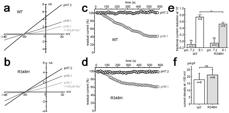Figure 5. pH-gating of R348H channels expressed in astrocyte-like cells.Sample current traces for WT (a) and R348H (b) channel expressed in U251 cells, and recorded in the whole-cell configuration by applying voltage ramps from −140 to +30 mV (holding potential of −80 mV), immediately after the establishment of the whole-cell configuration (pHi7.2), after 10 min (pHi6.1), and following external BaCl2 application (pHi6.1 + 100 μM Ba2+). Both cells were recorded using an intracellular pipette solution having a pH of 6.1. (c,d) Representative time courses of WT (c) and R348H (d) currents recorded at −100 mV (normalized to the current recorded immediately after the establishment of the whole-cell configuration), using a pipette solution with pH of either 7.2 (black circles) or 6.1 (grey circles). (e) Plot of the mean fractional WT and R348H current inhibition by an intracellular pH of either 7.2 or 6.1. The fractional current reduction was estimated at −100 mV and calculated as 1− (I10 min/I0 min), in experiments similar to those shown in panels a–d. (f) Plot of the mean WT and R348H current density at −100 mV of applied potential. |